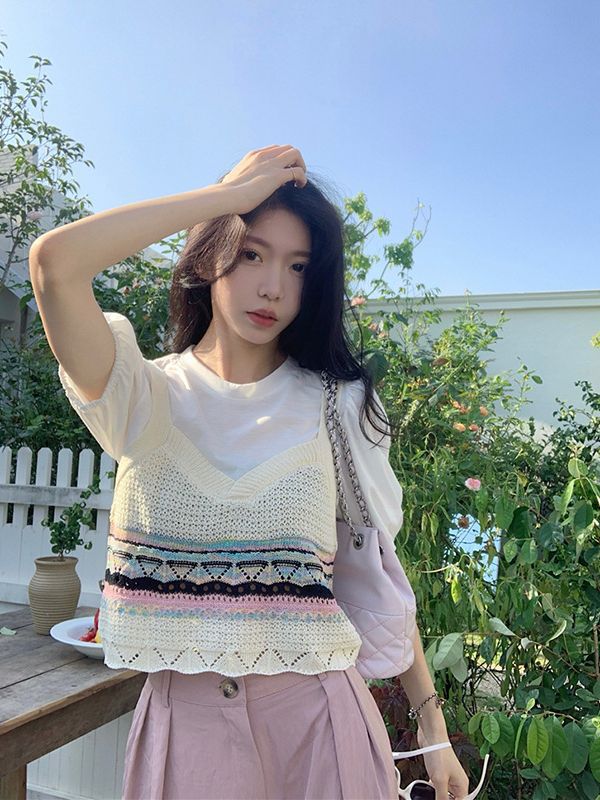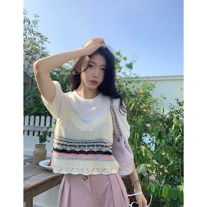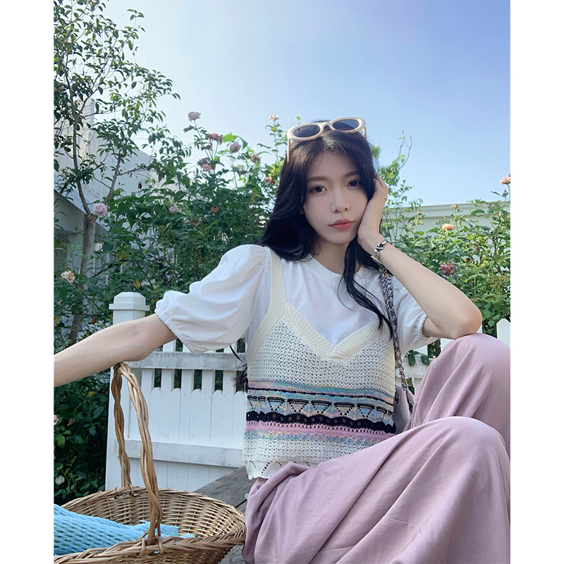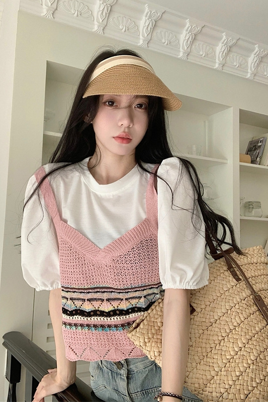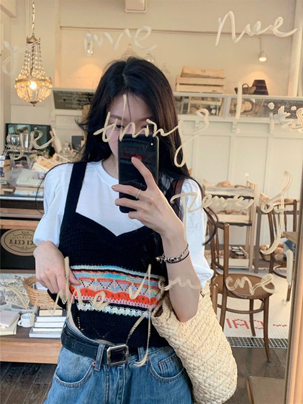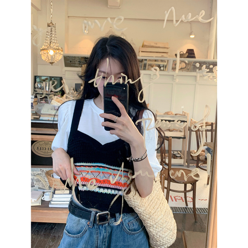 法式假两件针织T恤女夏季新款宽松设计感拼接短款泡泡袖上衣