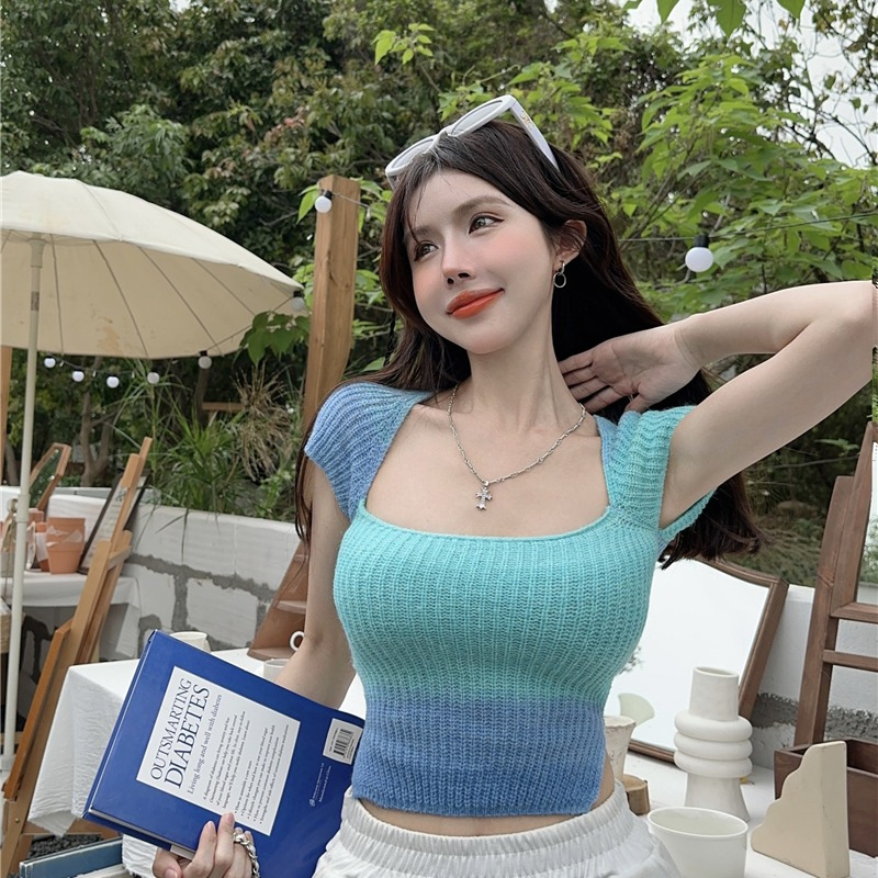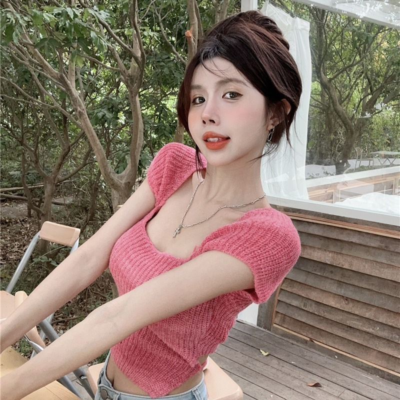 纯欲辣妹短袖针织t恤女新款夏季短款露背绑带特别致小上衣