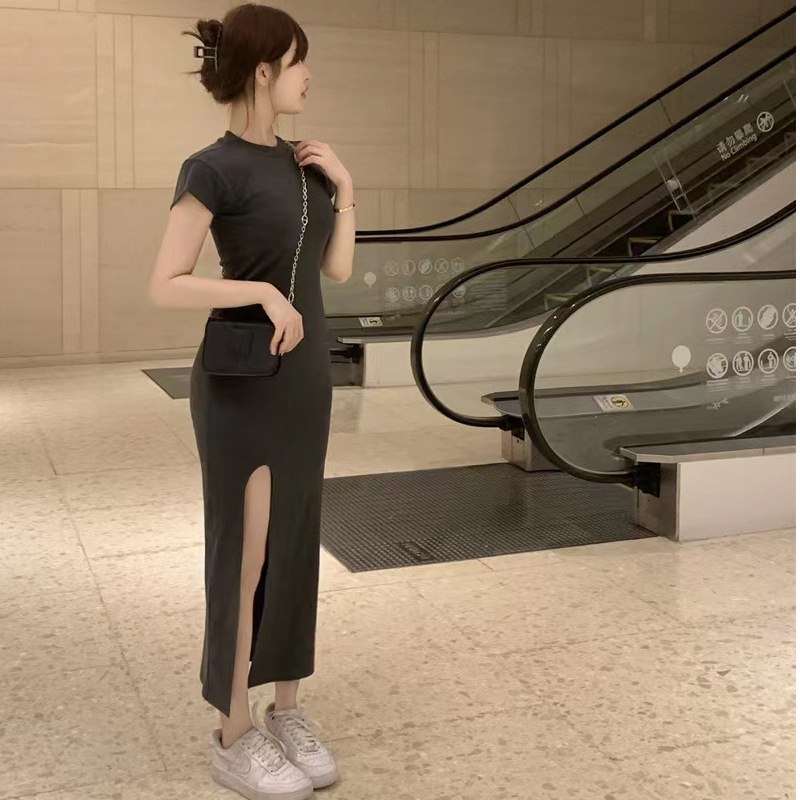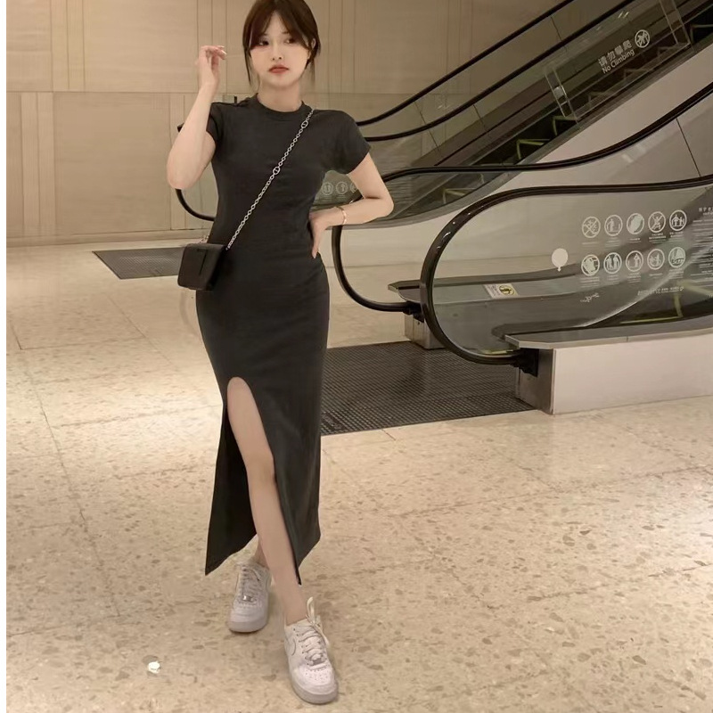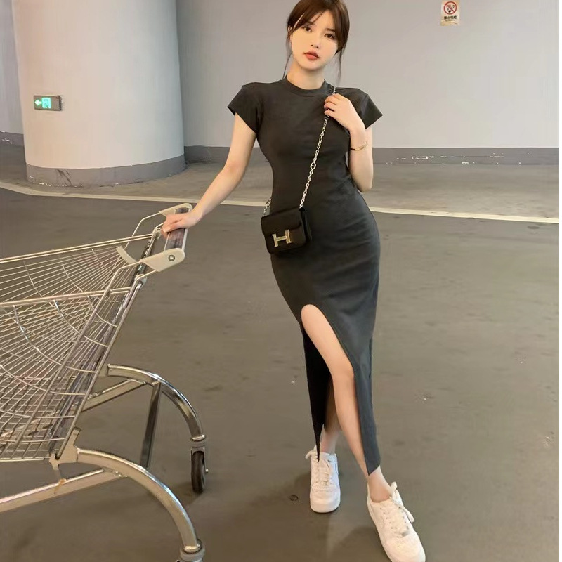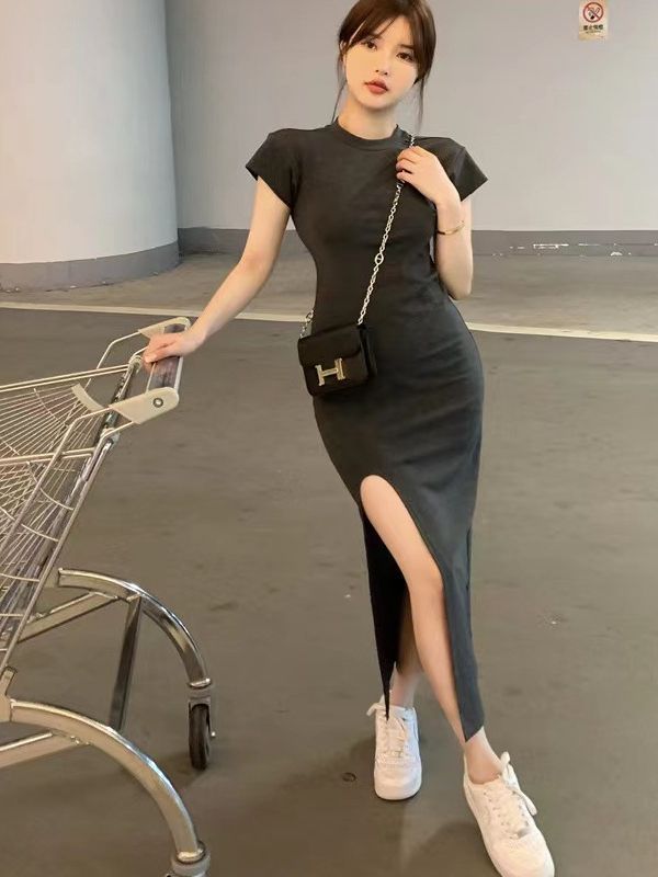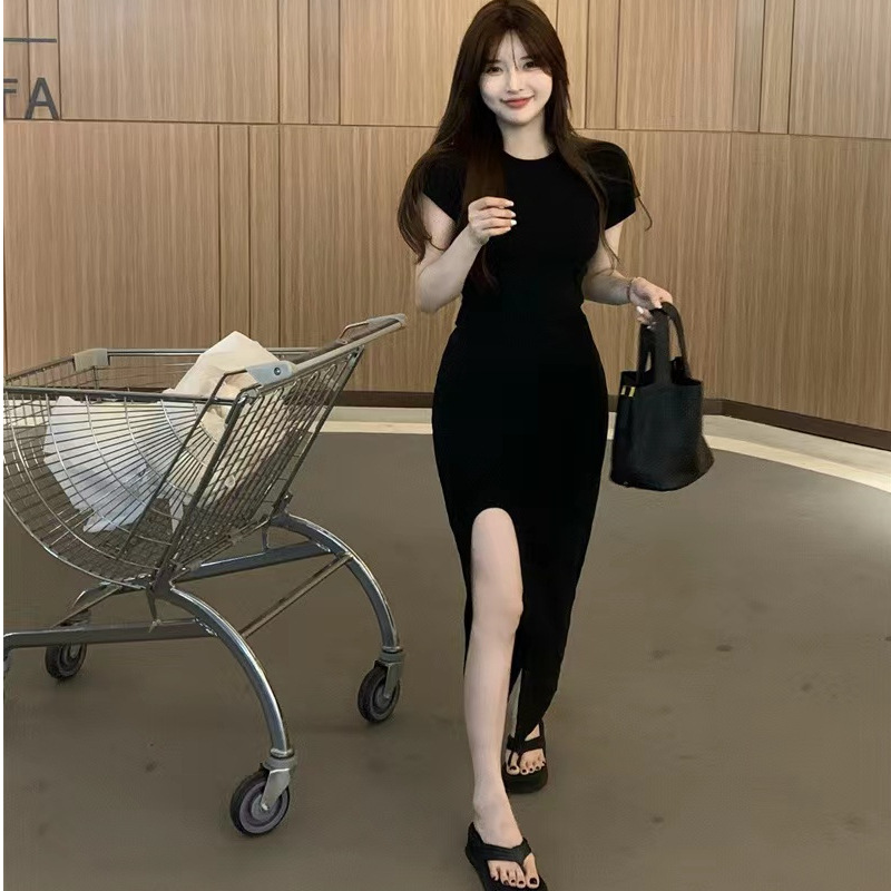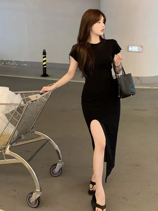 辣妹短袖T恤连衣裙女装夏季新款黑色开叉性感过膝中长款裙子
