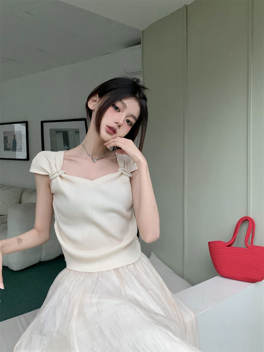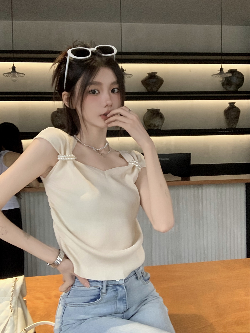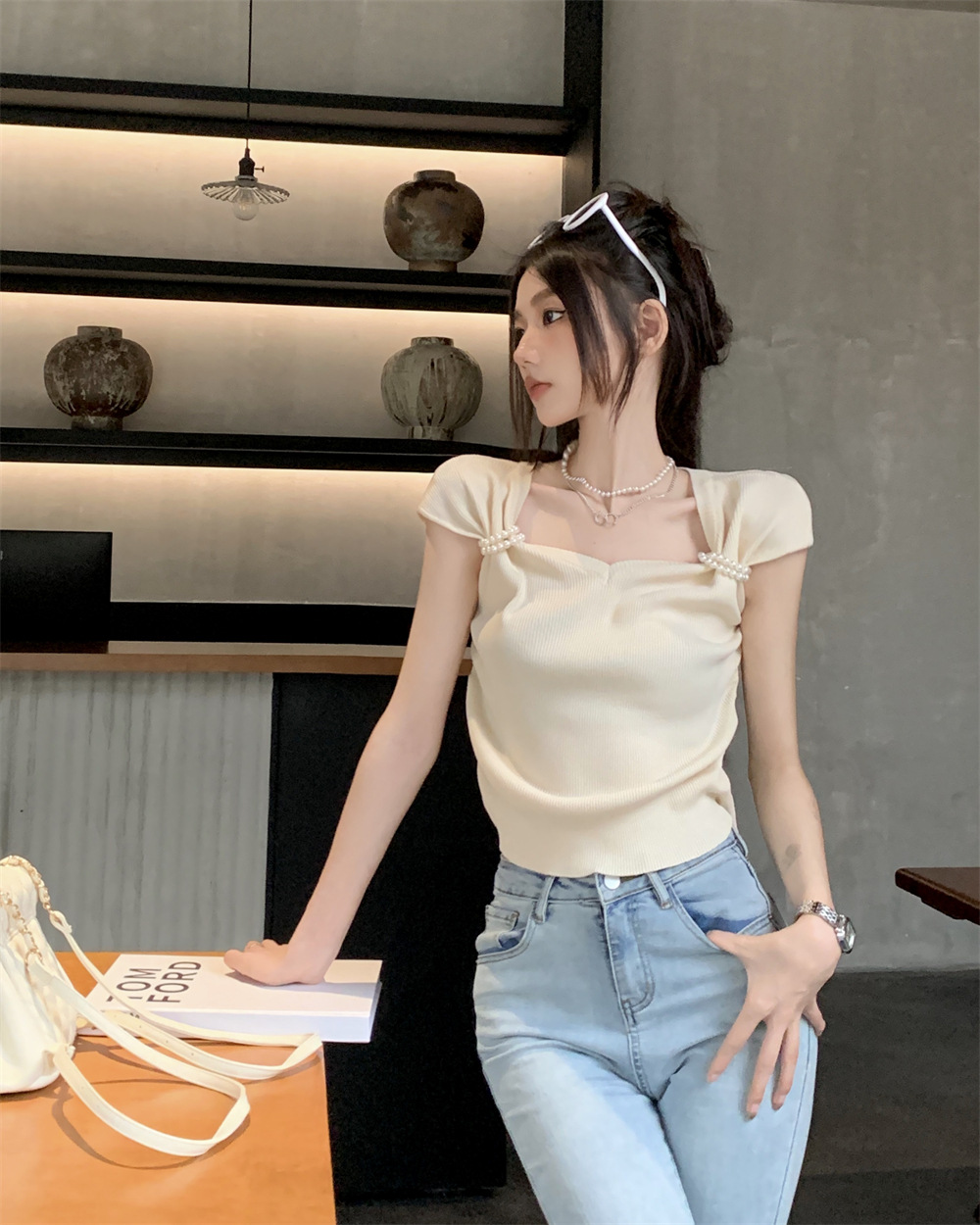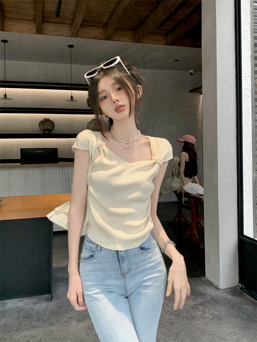 法式V领褶皱打底T恤夏季复古新款修身时尚气质短款打底外穿上衣女