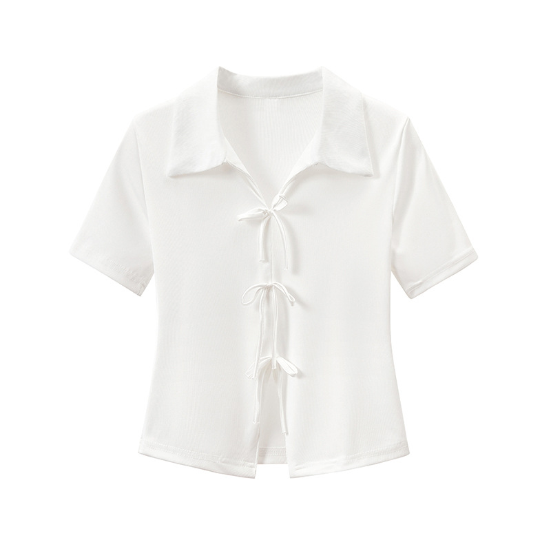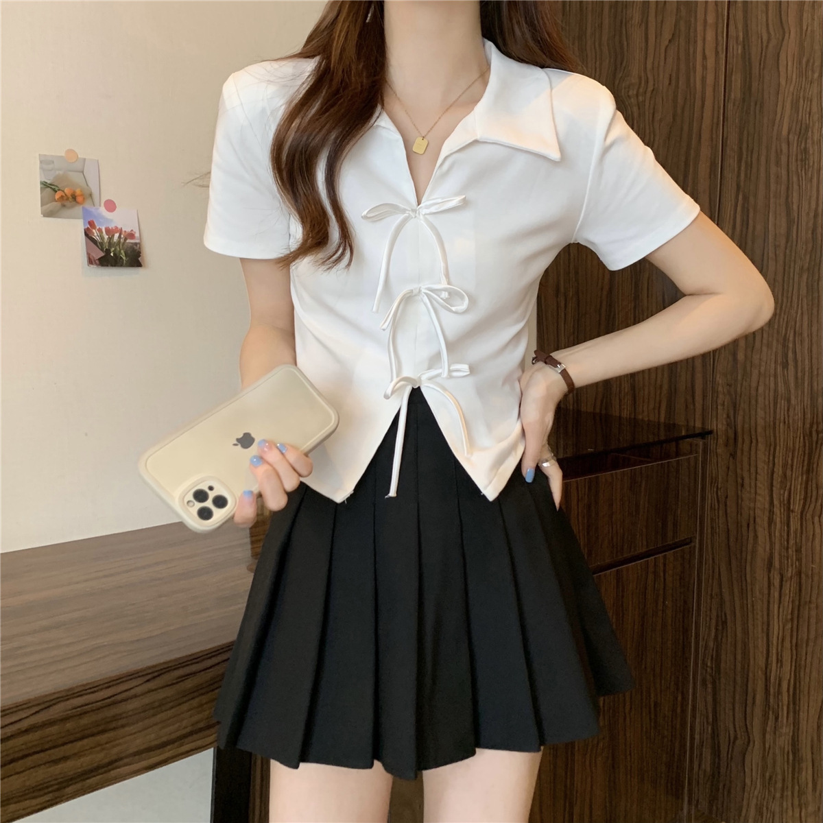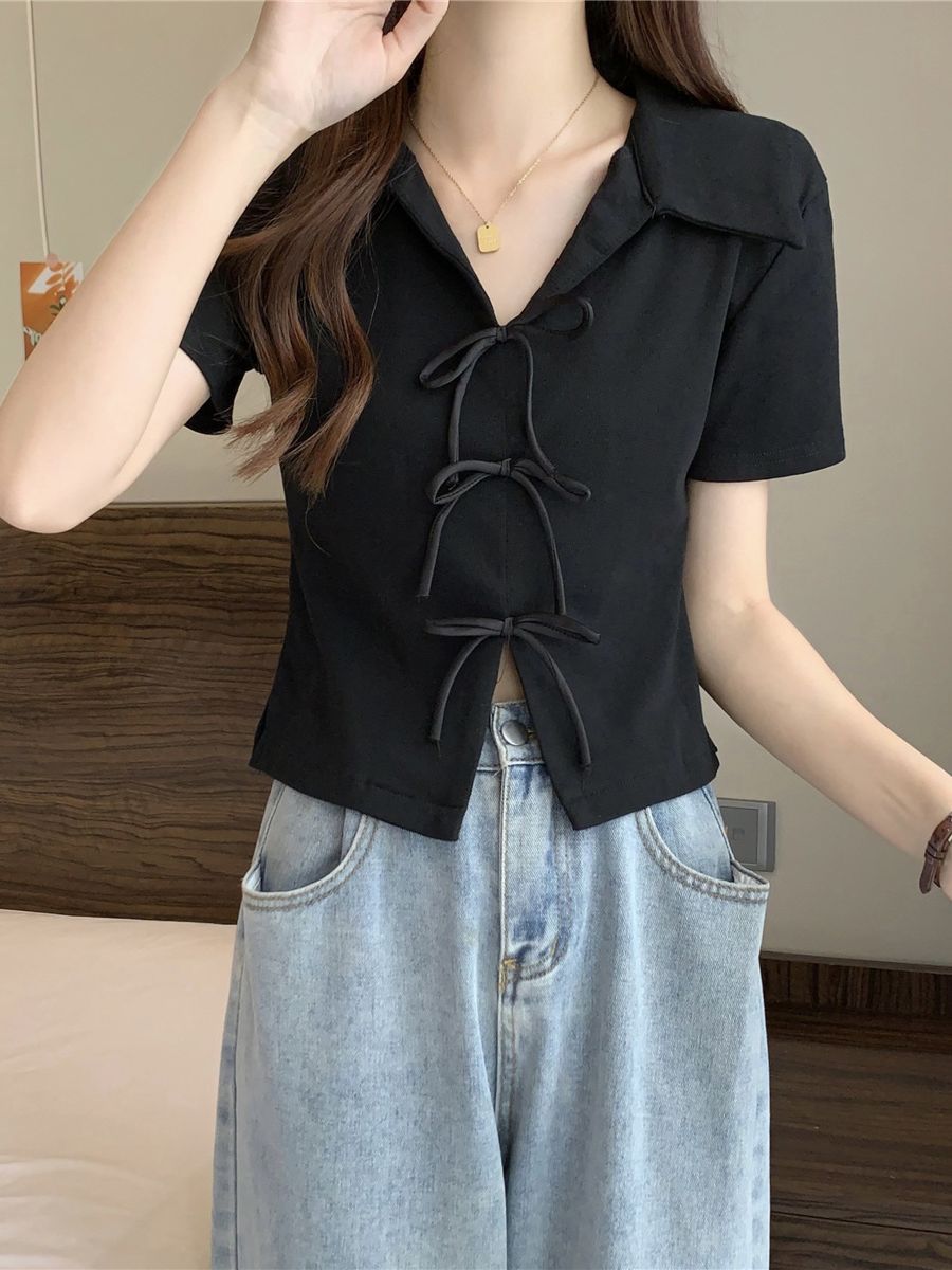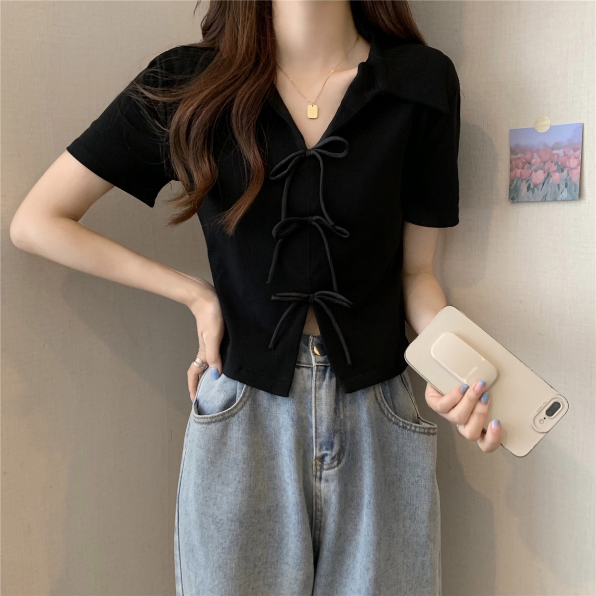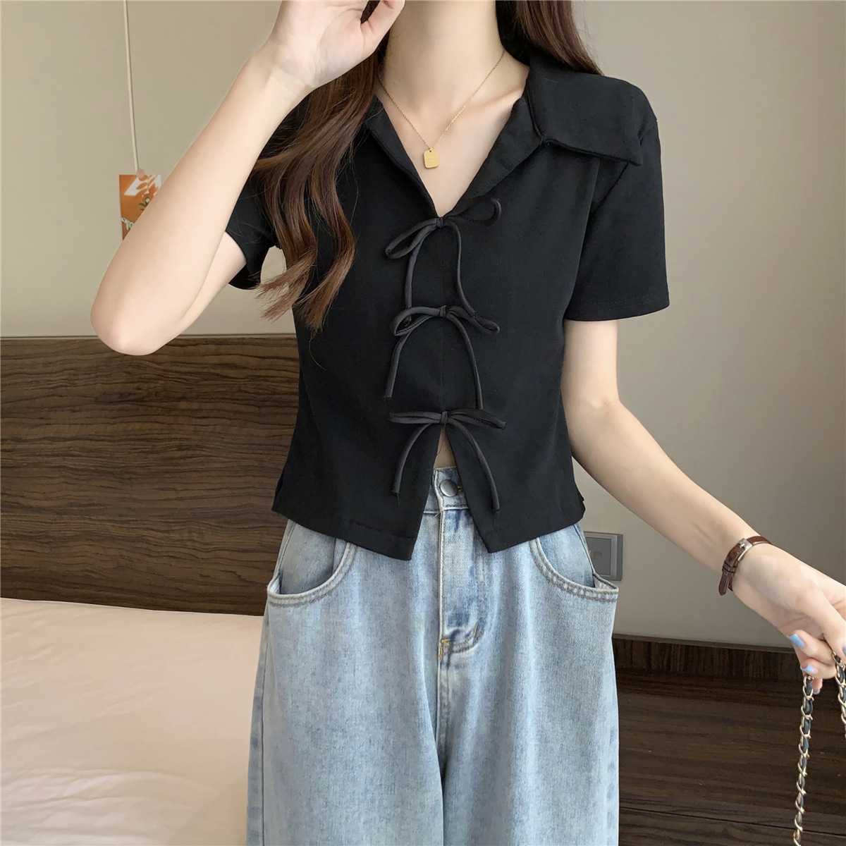 纯欲甜辣蝴蝶结polo领短袖t恤女夏季设计感小众法式短款正肩上衣