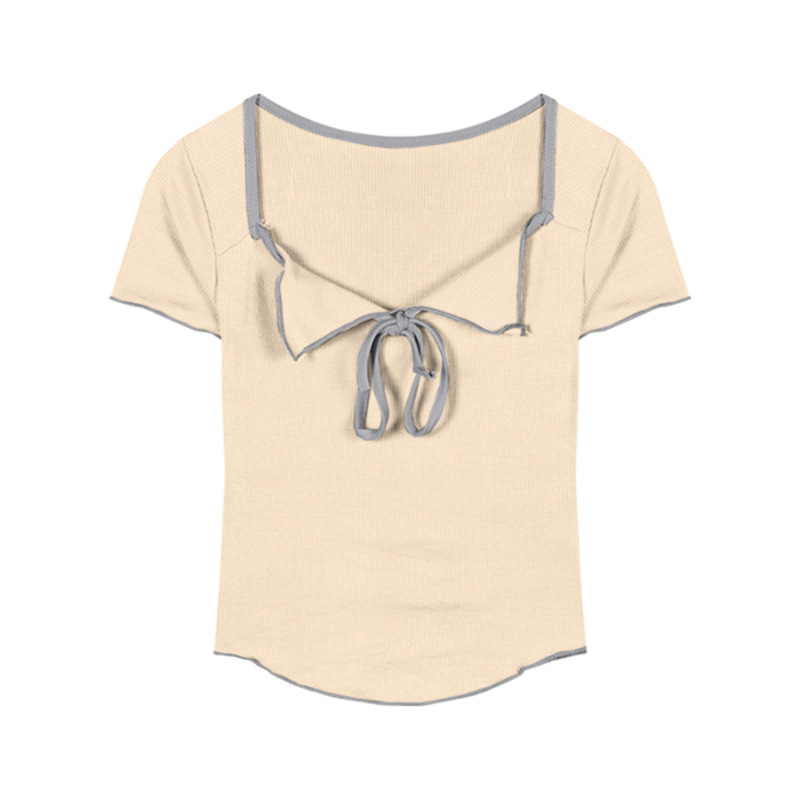 辣妹黄色方领正肩短袖T恤女设计感小众夏季短款修身绑带撞色上衣
