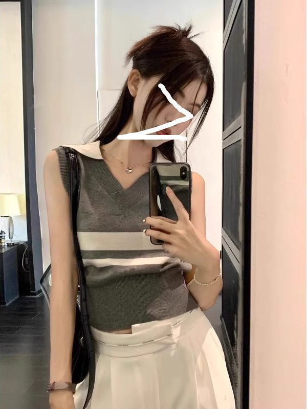 灰色学院风条纹针织背心女夏季新款美式polo领短款修身外穿打底衫