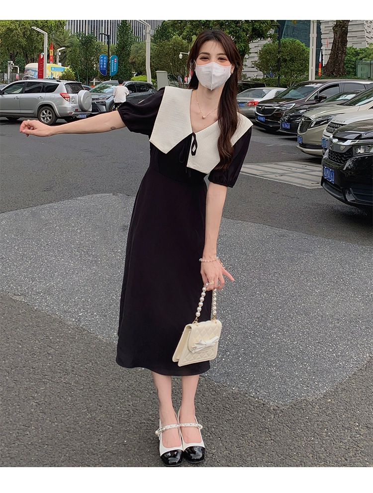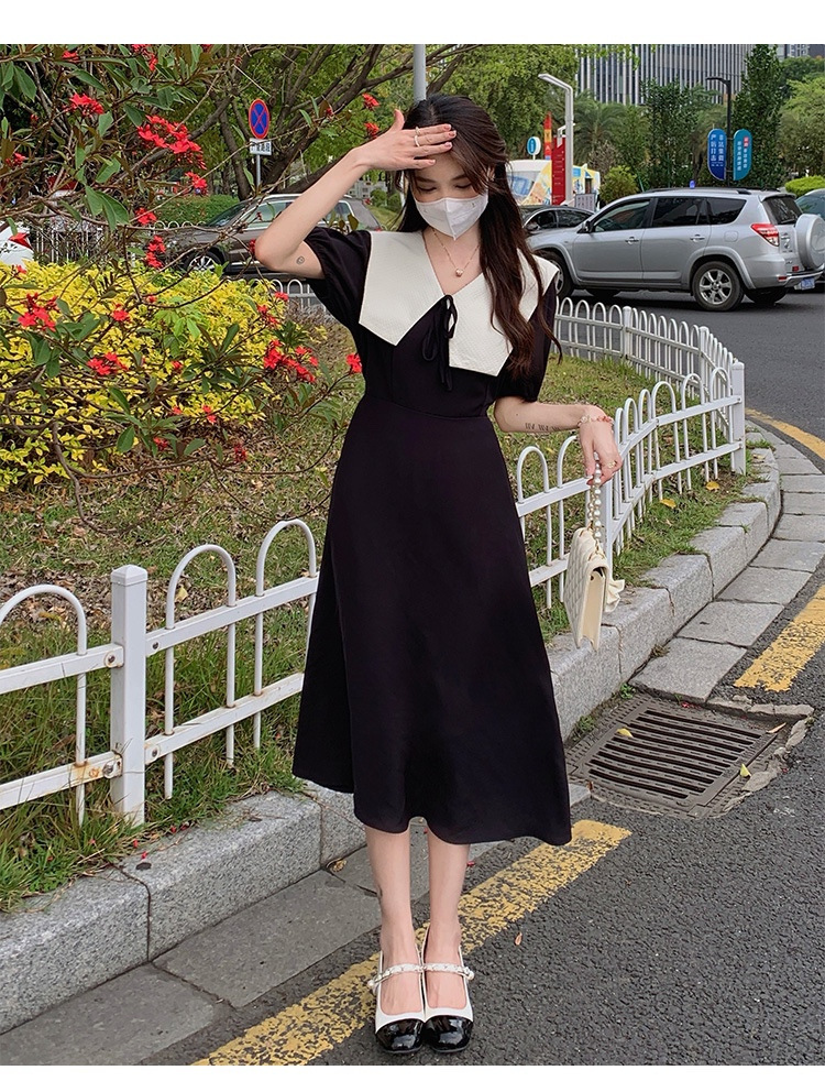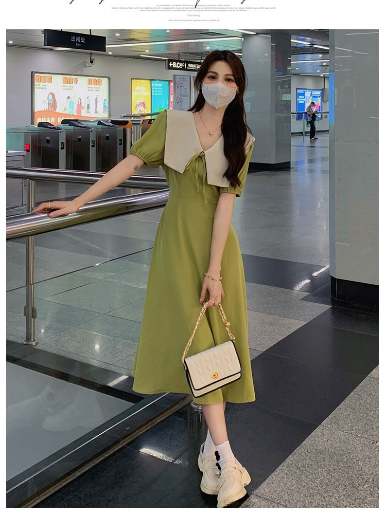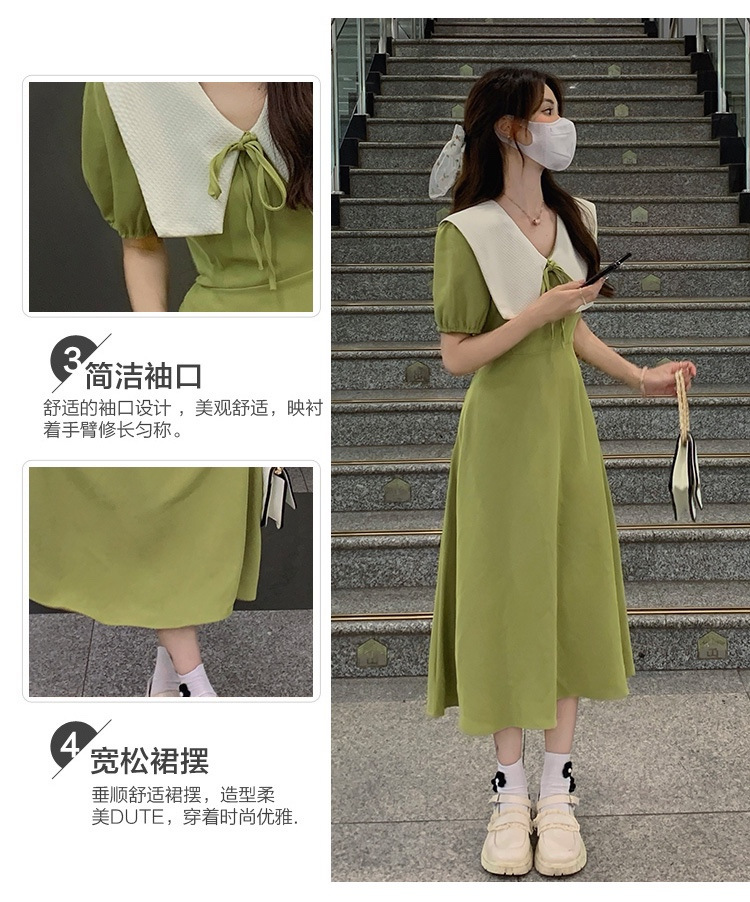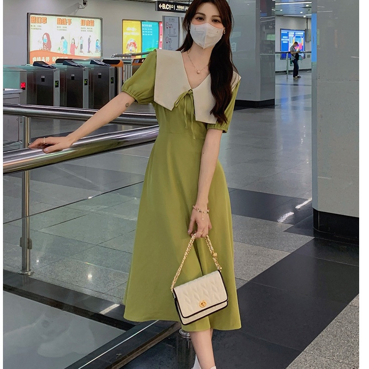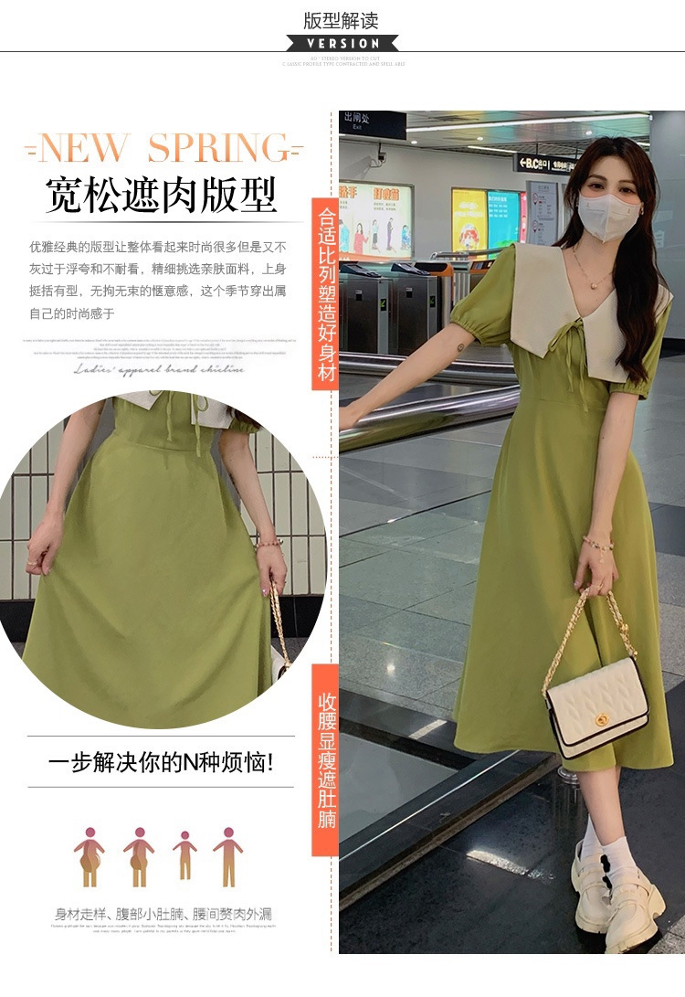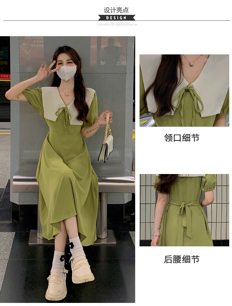 轻熟温柔风娃娃领气质系带收腰连衣裙女夏季新款复古拼接撞色长裙