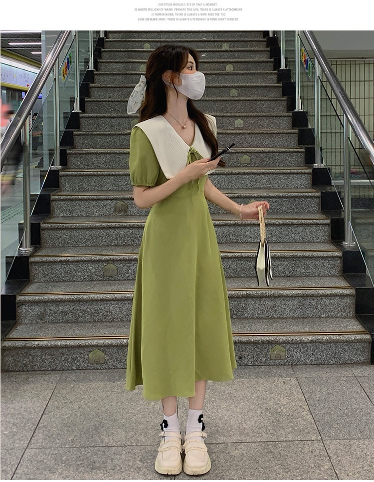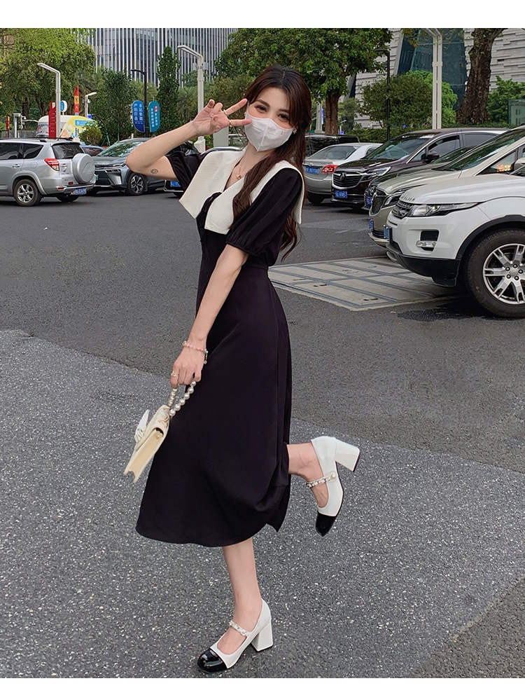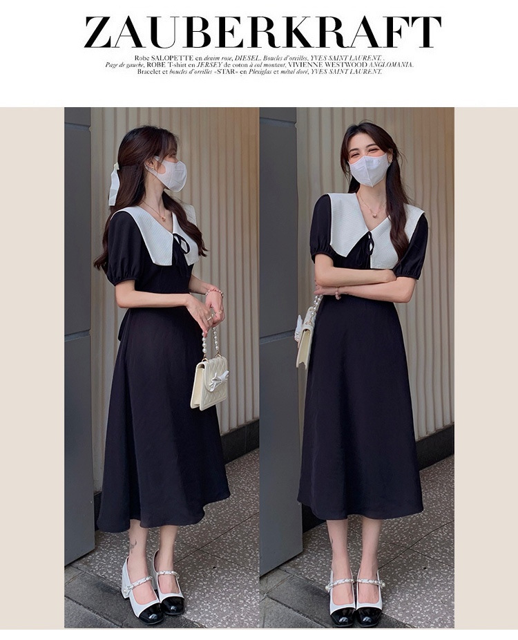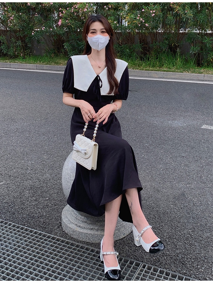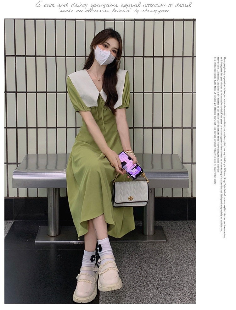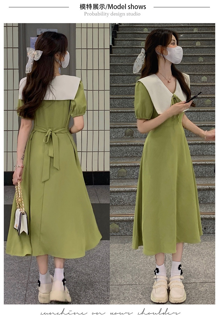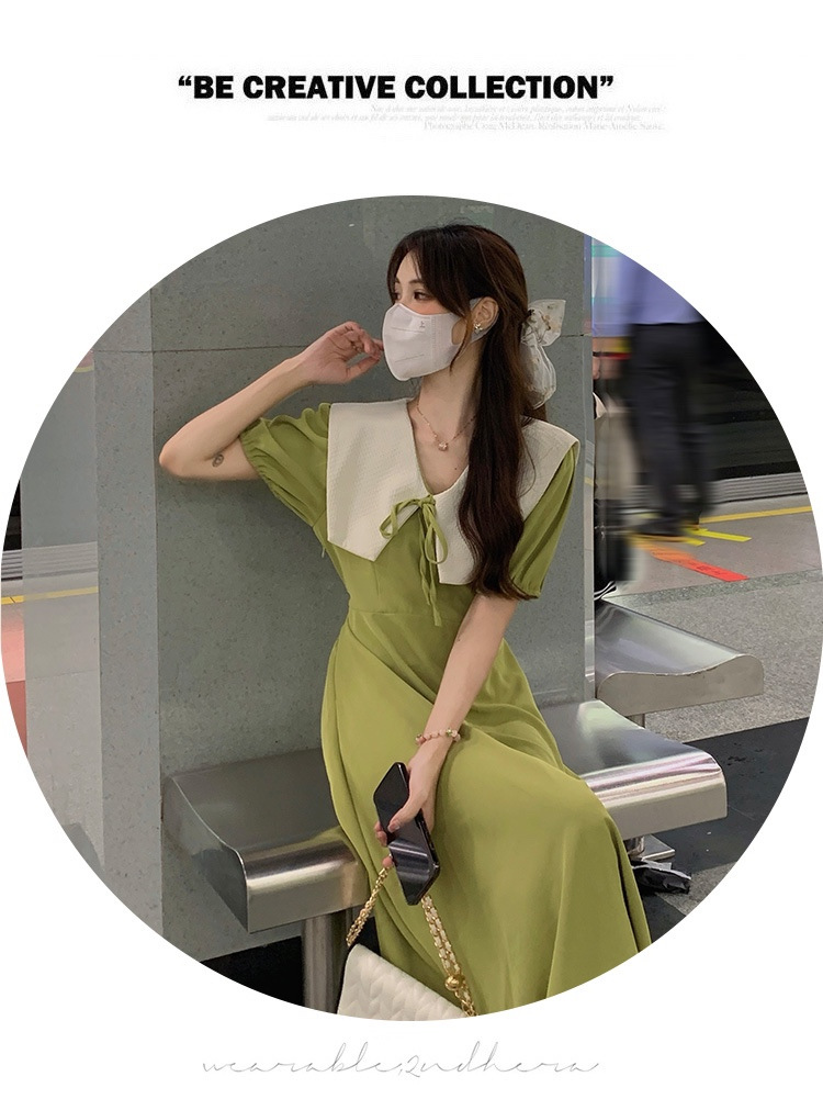 轻熟温柔风娃娃领气质系带收腰连衣裙女夏季新款复古拼接撞色长裙