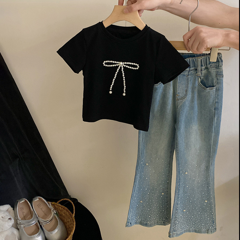 韩版童装夏季套装新款简约蝴蝶结T恤网红潮范烫钻牛仔裤童装