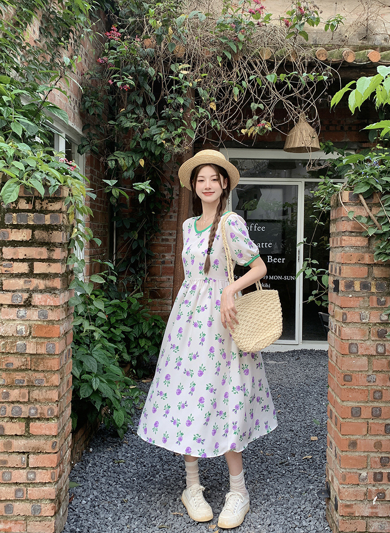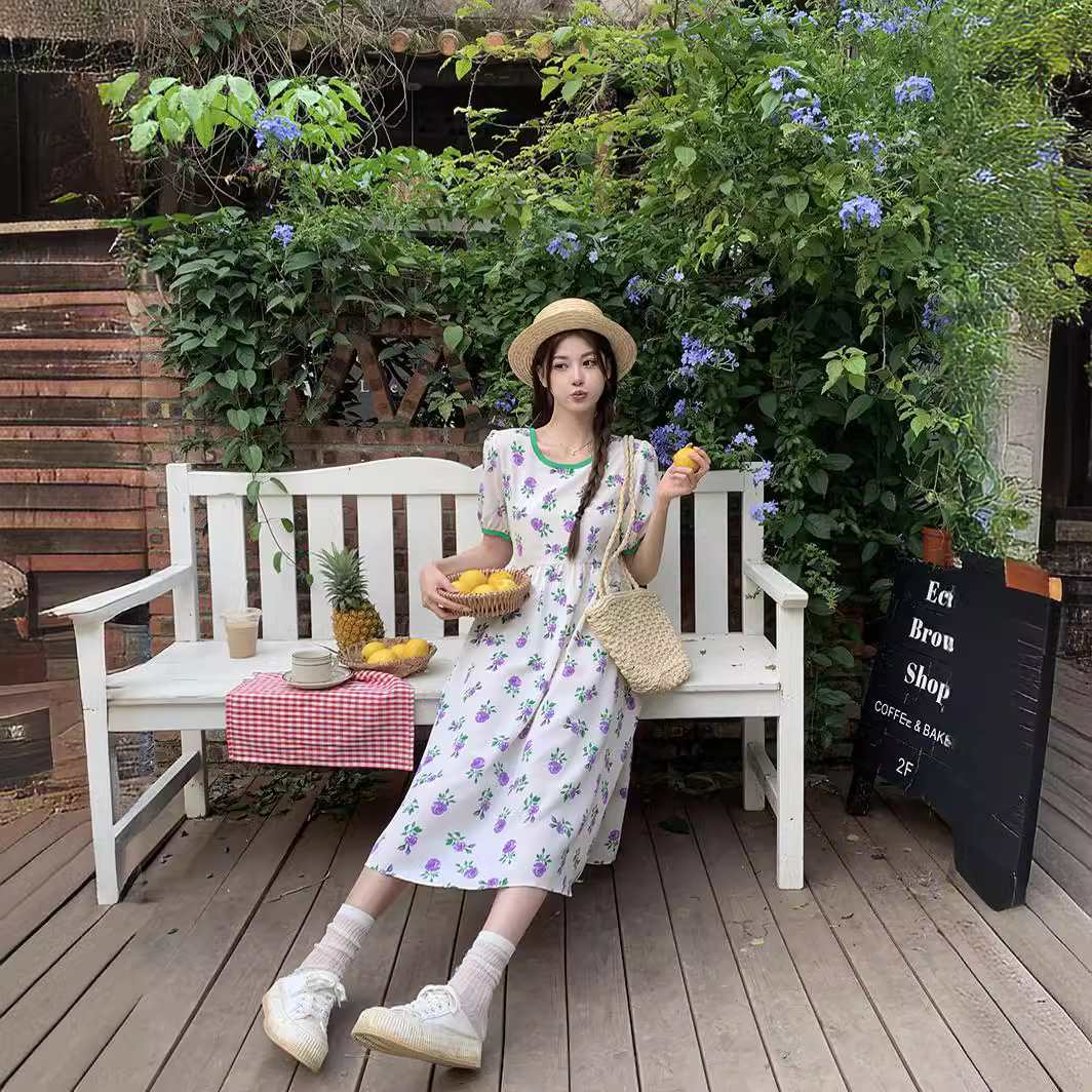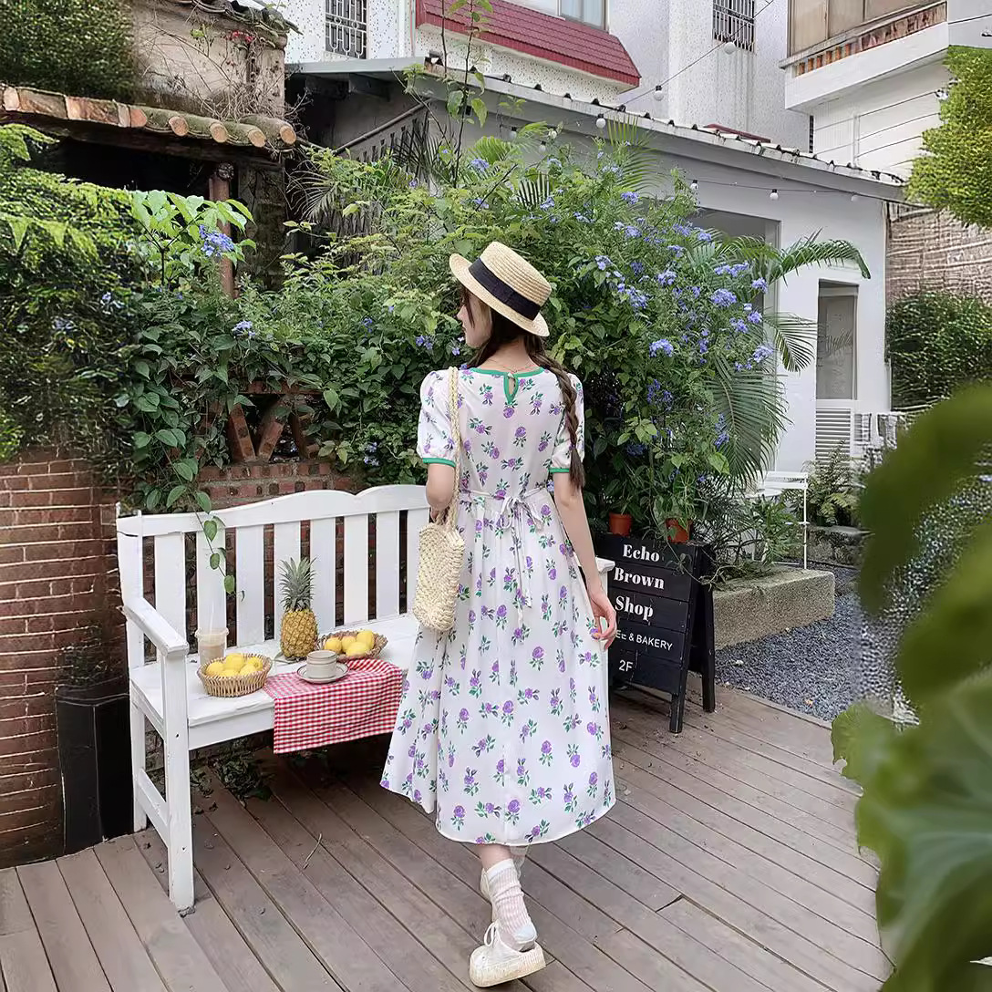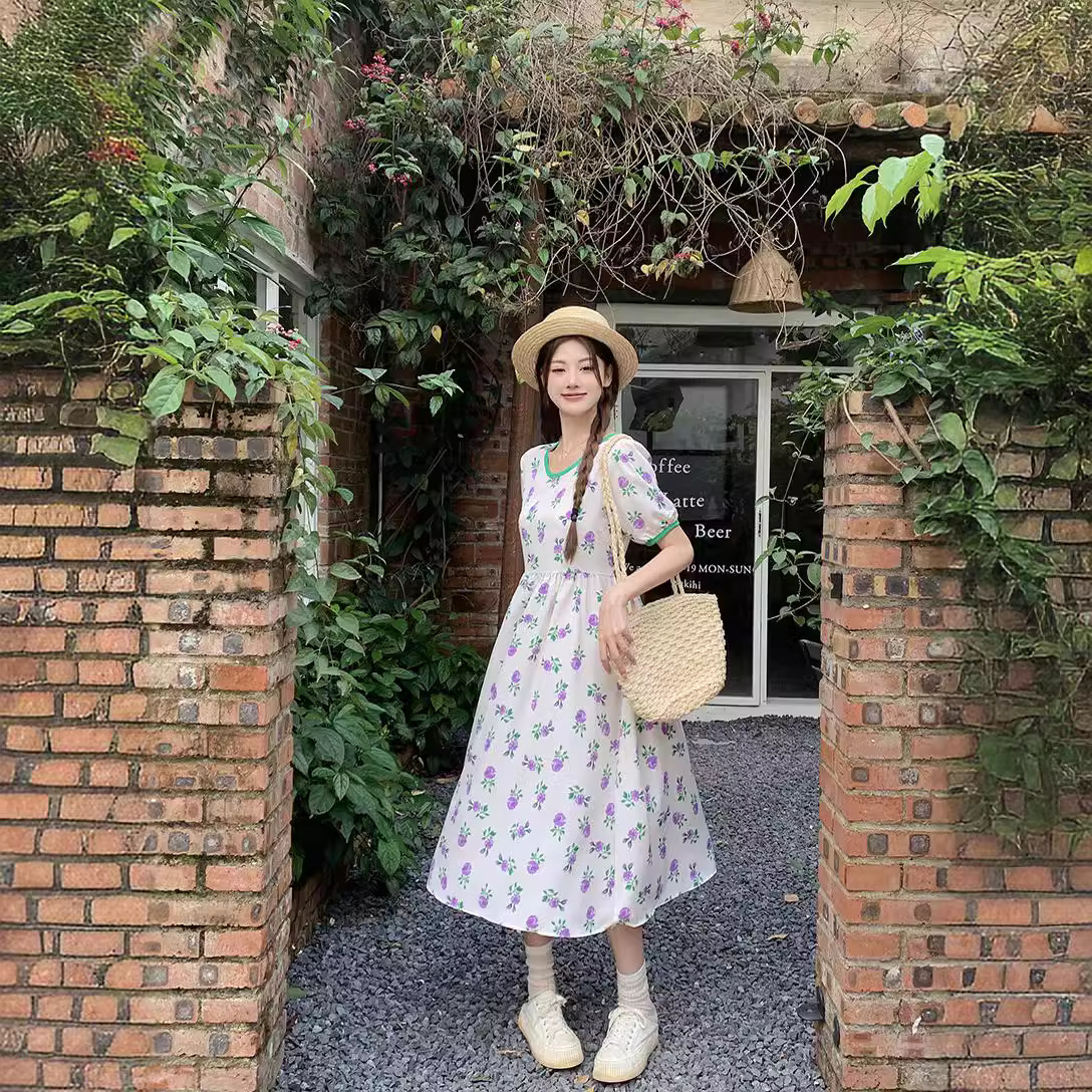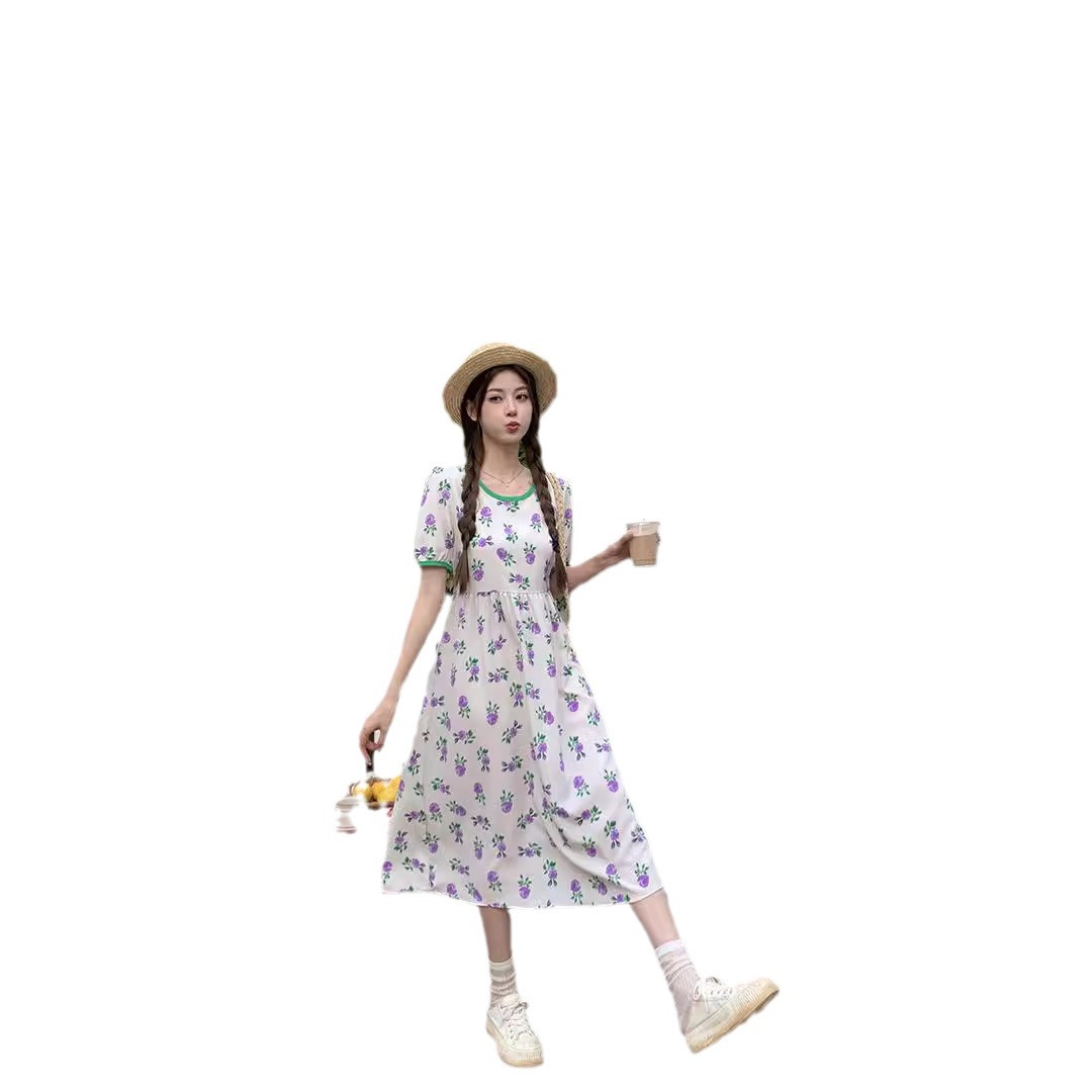 实拍现货~法式复古碎花长裙女夏新款高级感收腰甜美气质超仙桔梗