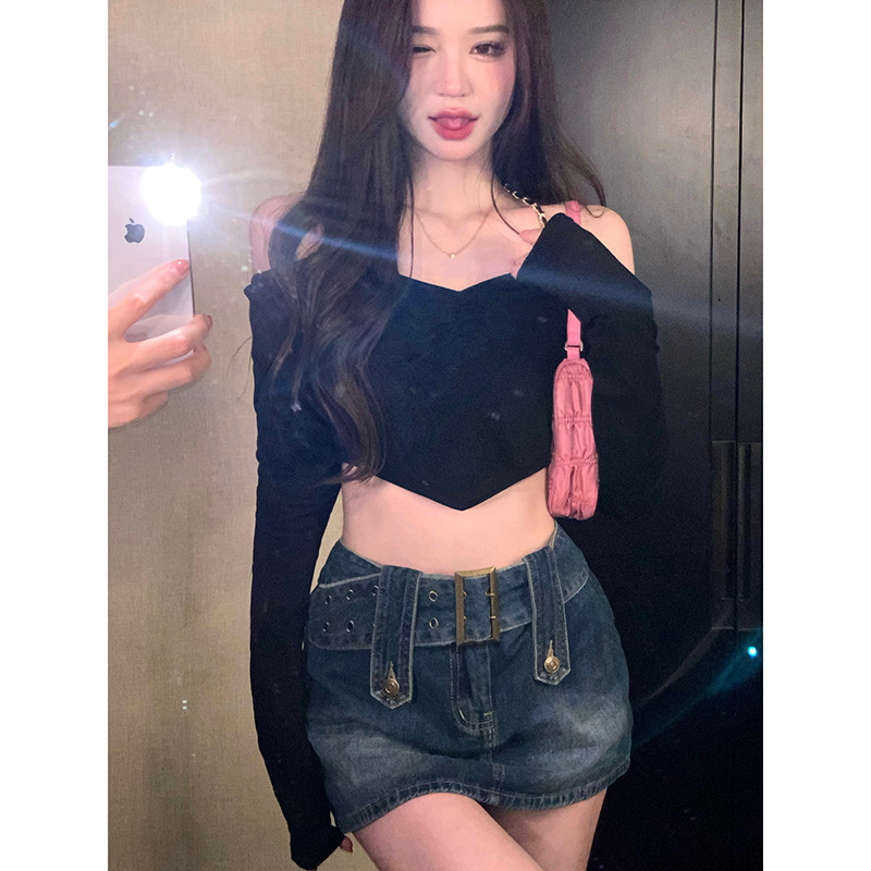 黑色长袖链条挂脖T恤女夏季辣妹一字肩性感露背修身别致短款上衣