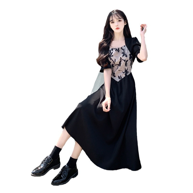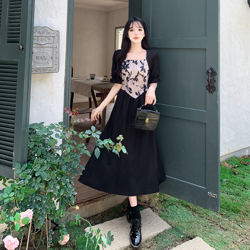 实拍现货~法式高级感长裙夏季甜美收腰显瘦拼接撞色赫本风连衣裙