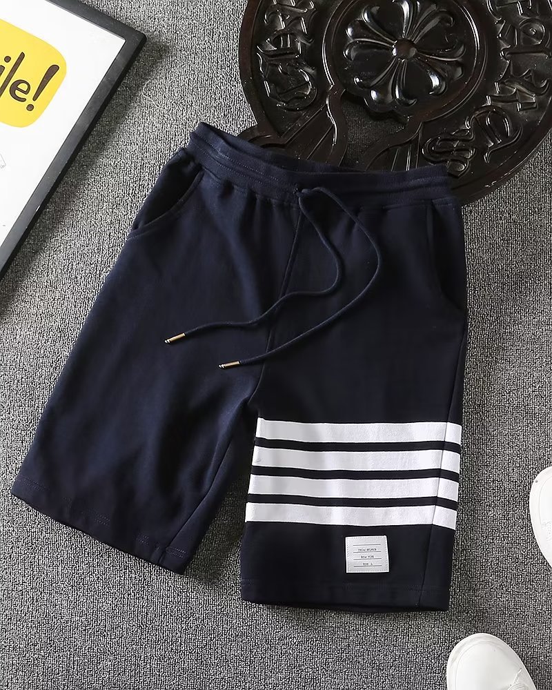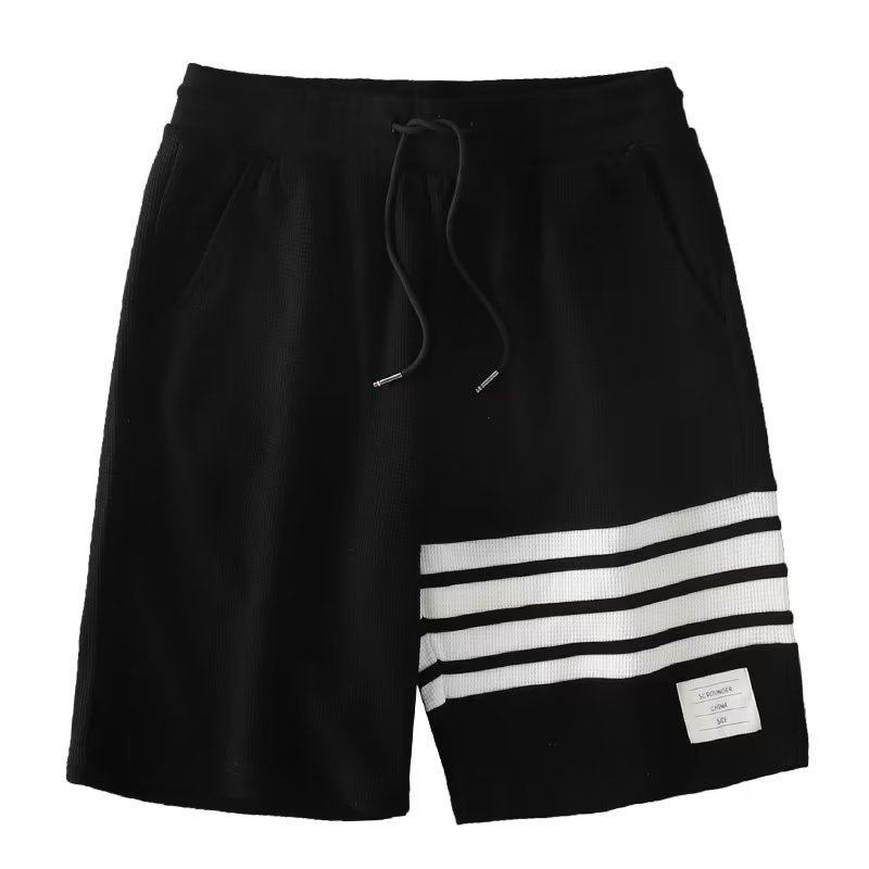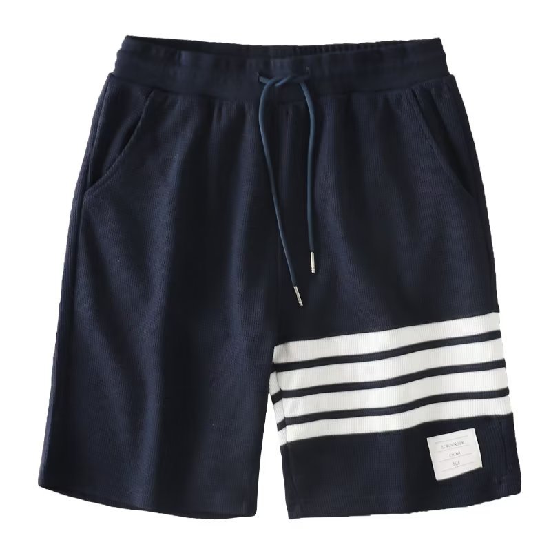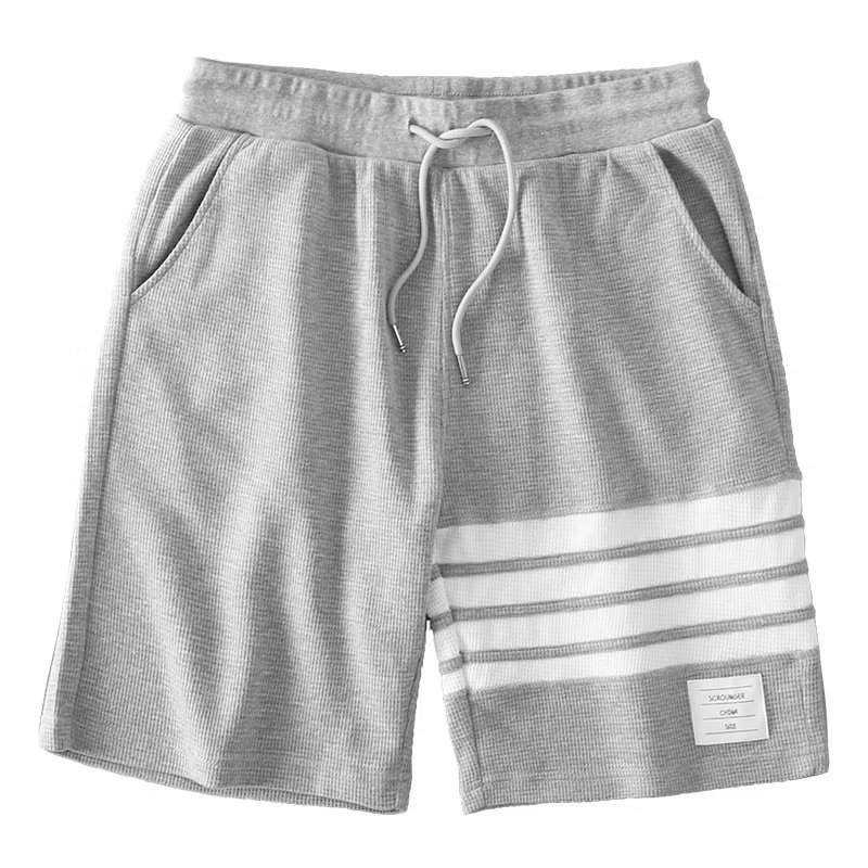 华夫格短裤男夏季外穿四条杠条纹五分裤灰色运动休闲中裤