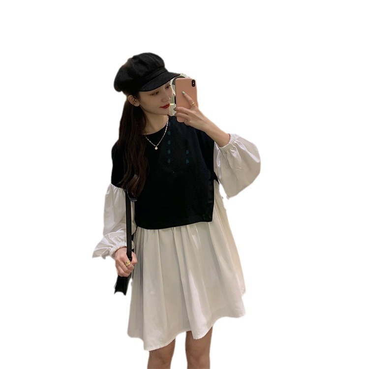 法式小众假两件连衣裙女春装中长款气质显瘦泡泡袖初恋裙外贸外单