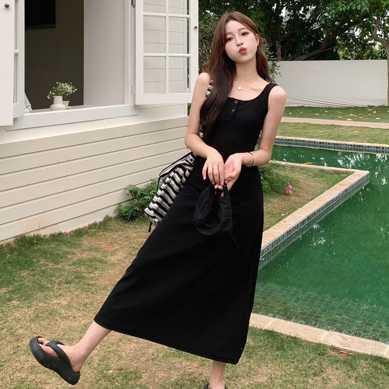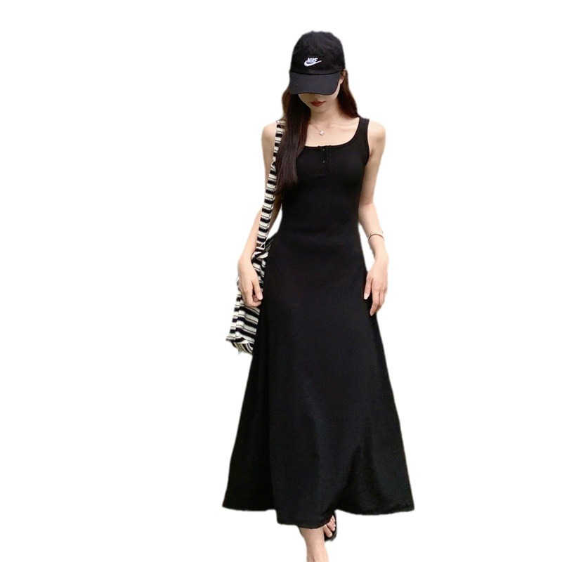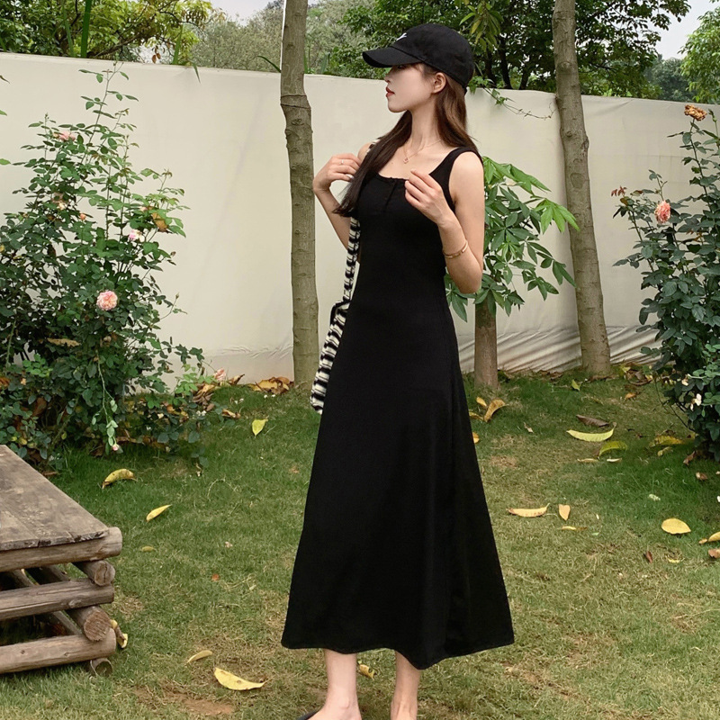 实拍现货~黑色方领连衣裙女夏季小个子显瘦吊带包臀裙背心长裙