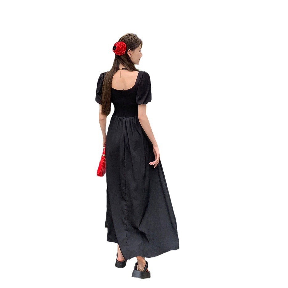 实拍现货~法式赫本风黑色连衣裙子夏季气质收腰显瘦性感开叉长裙