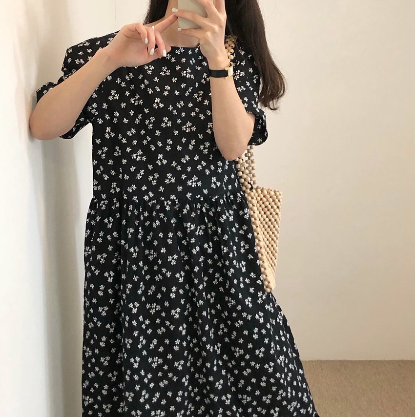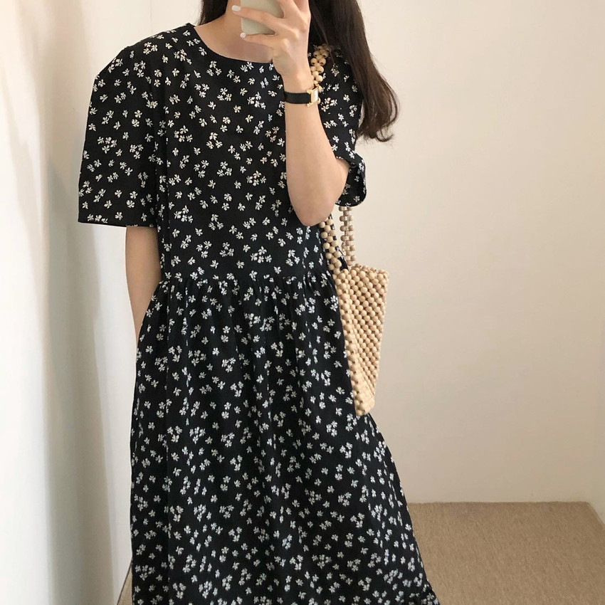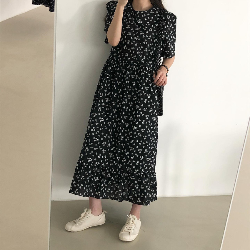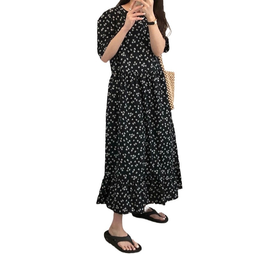 韩版设计款圆领黑色小碎花连衣裙夏新款显瘦纸片长裙外贸外单