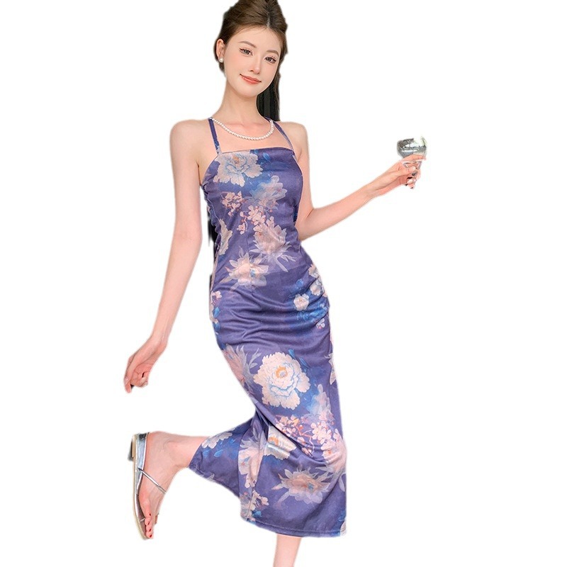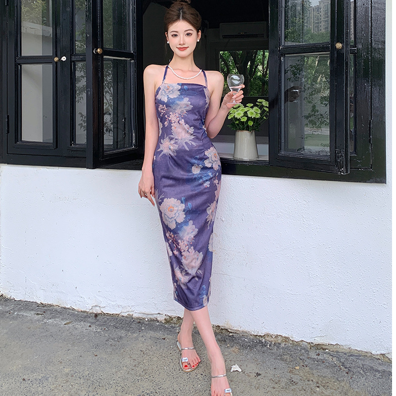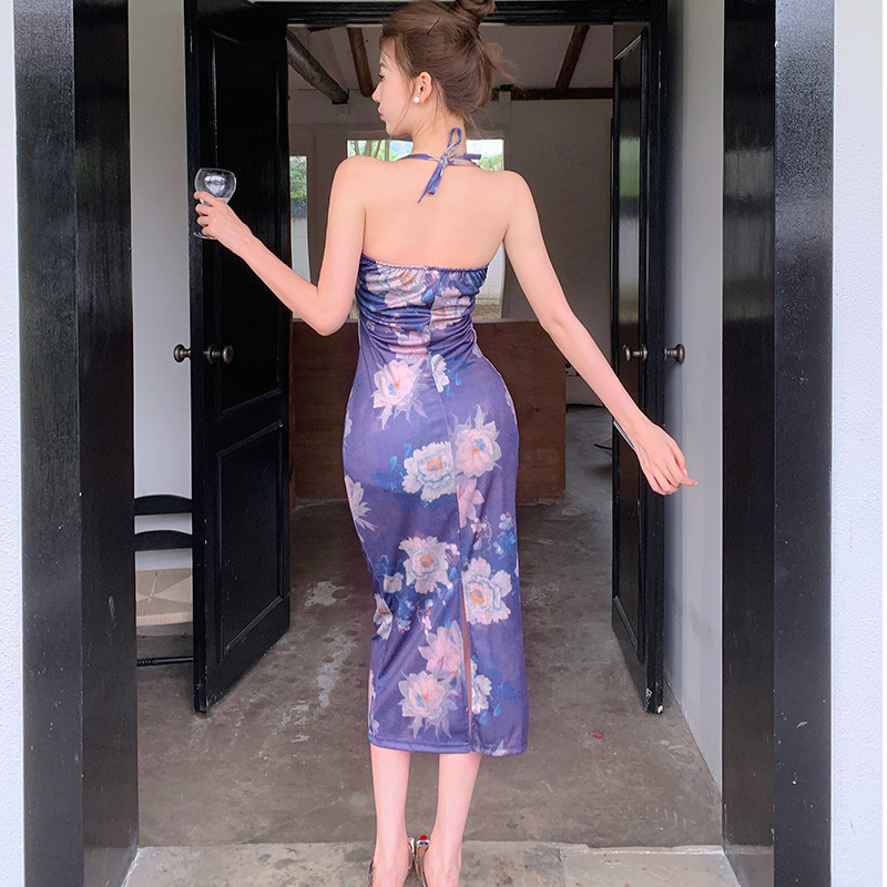 实拍现货~新中式中国风吊带挂脖连衣裙性感露背修身气质包臀长裙