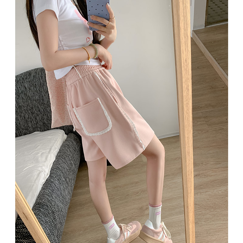 蕾丝边粉色运动短裤女夏薄款新款外穿高腰休闲阔腿中裤五分裤