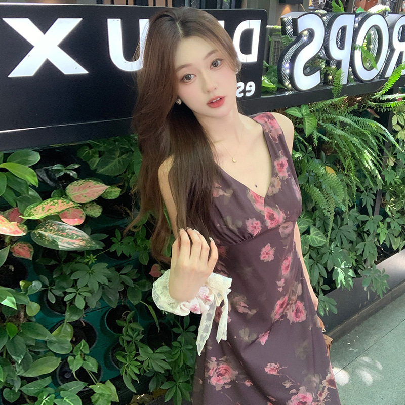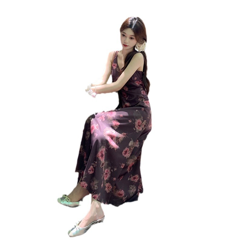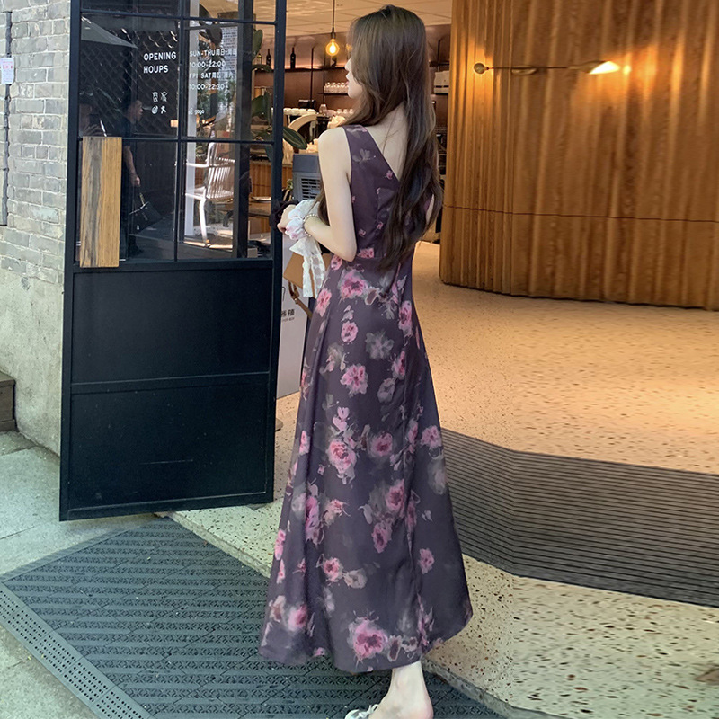 实拍现货~复古优雅V领玫瑰印花修身显瘦连衣裙女夏季无袖背心长裙