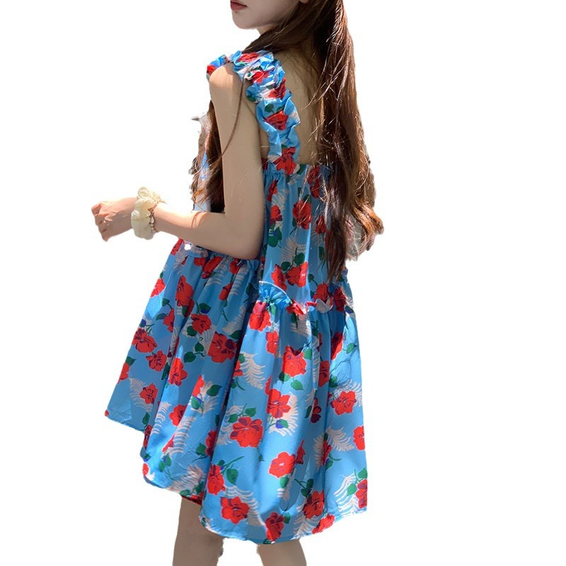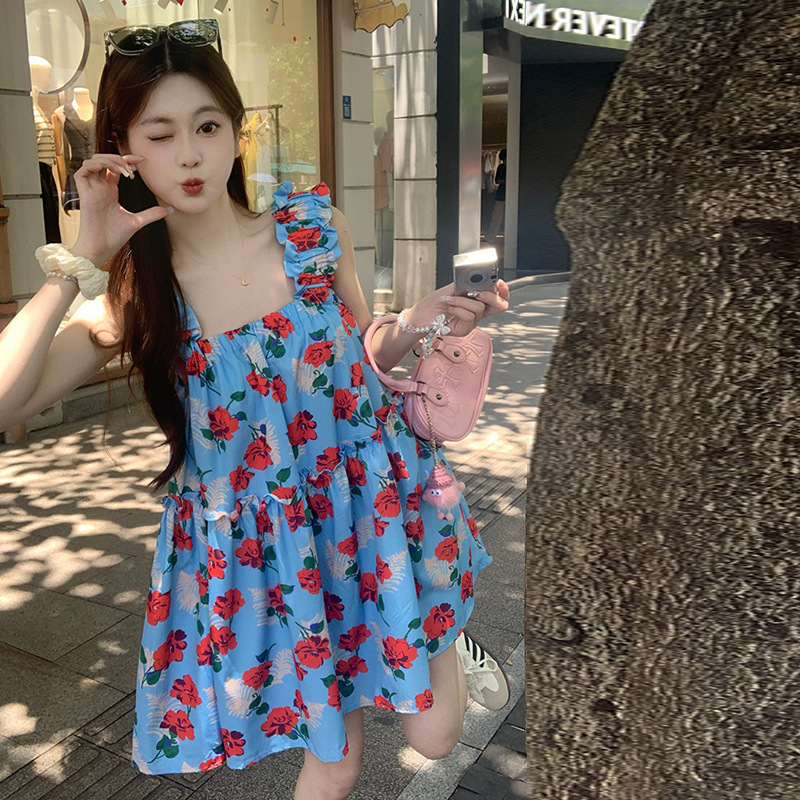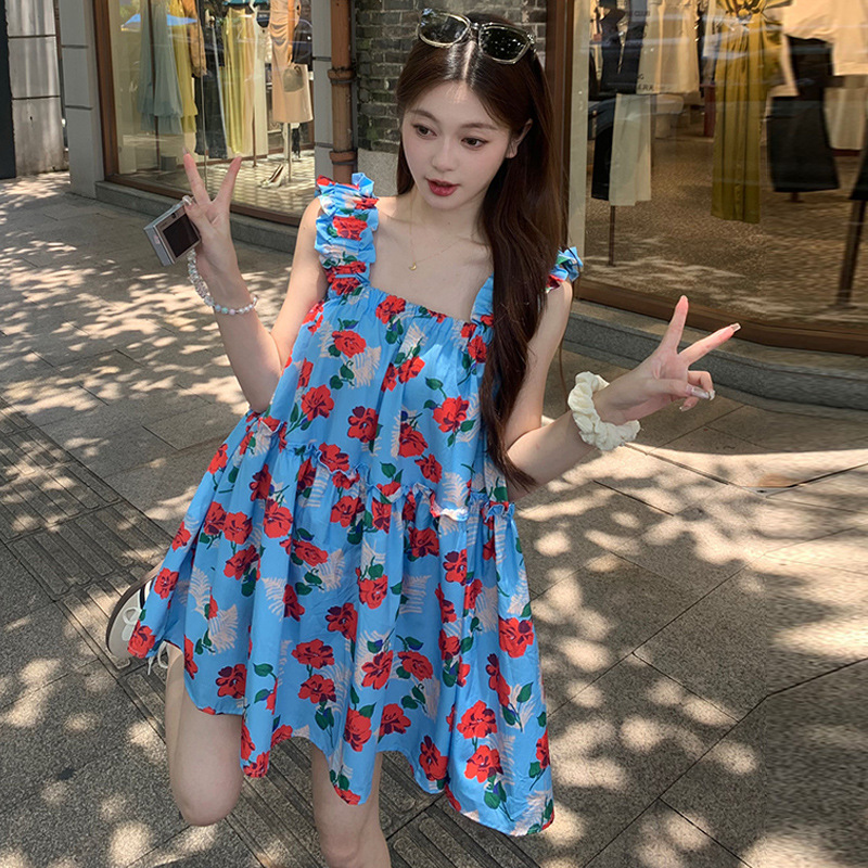 实拍现货~复古木耳边碎花吊带连衣裙夏季显瘦海边度假风甜美短裙