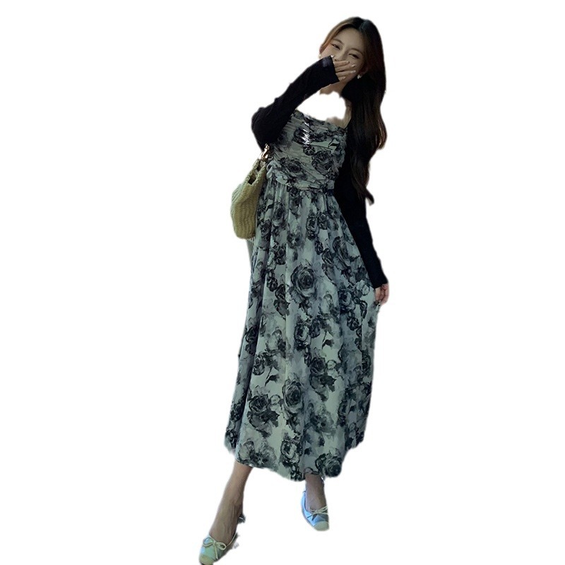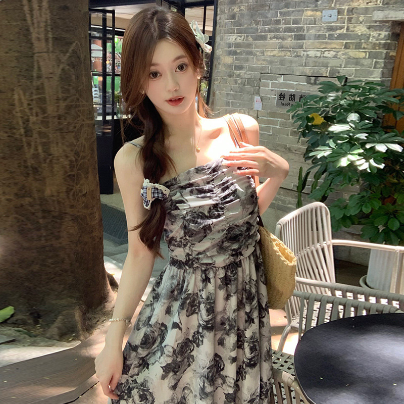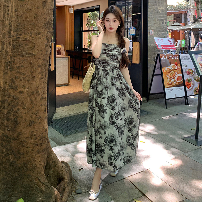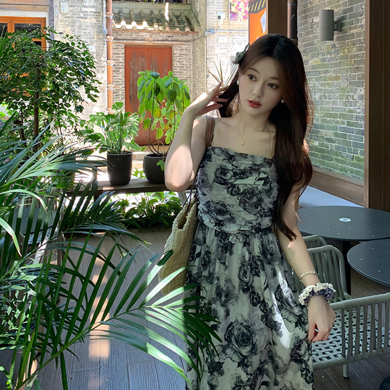 实拍现货~法式复古水墨碎花吊带连衣裙女夏季设计感气质收腰长裙