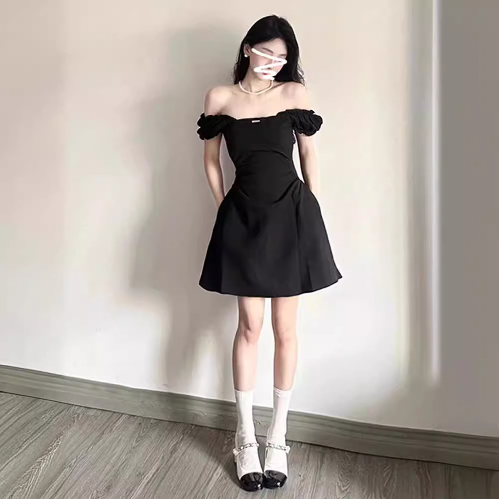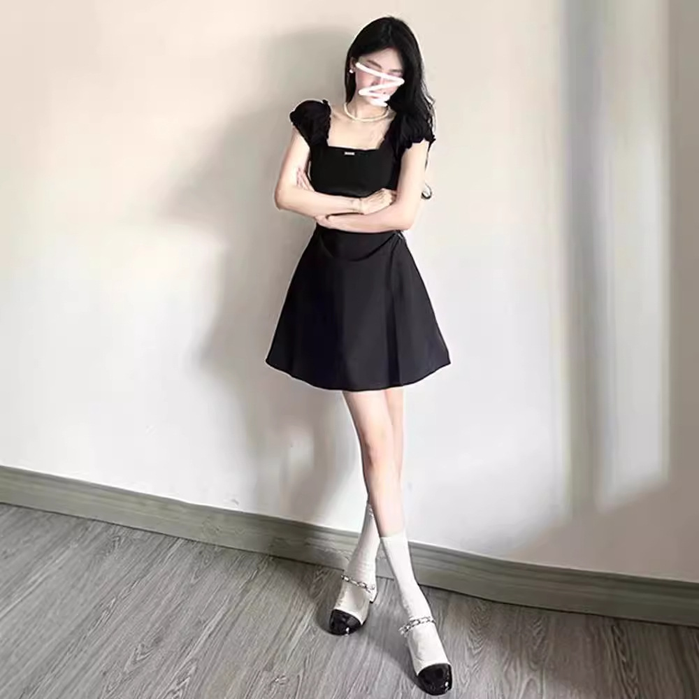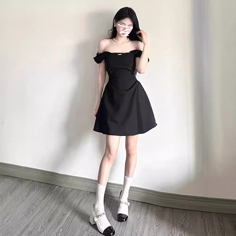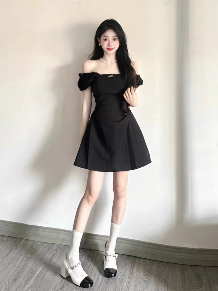 高级感黑色一字肩收腰连衣裙女夏季赫本风方领气质显瘦A字短裙子