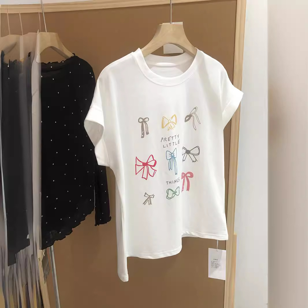 清新可爱的蝴蝶结印花卷边袖宽松显瘦纯白色圆领短袖t恤上衣女