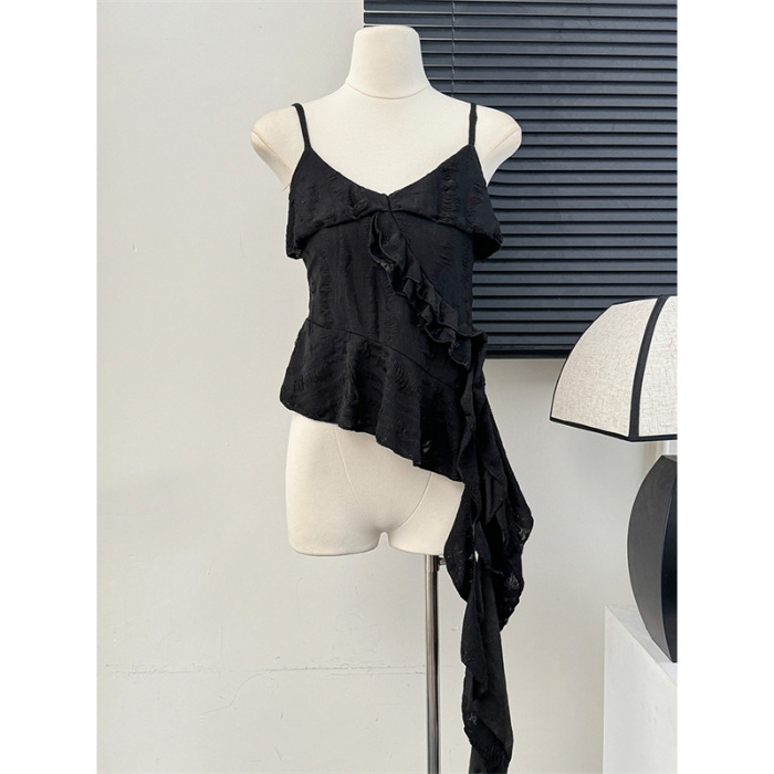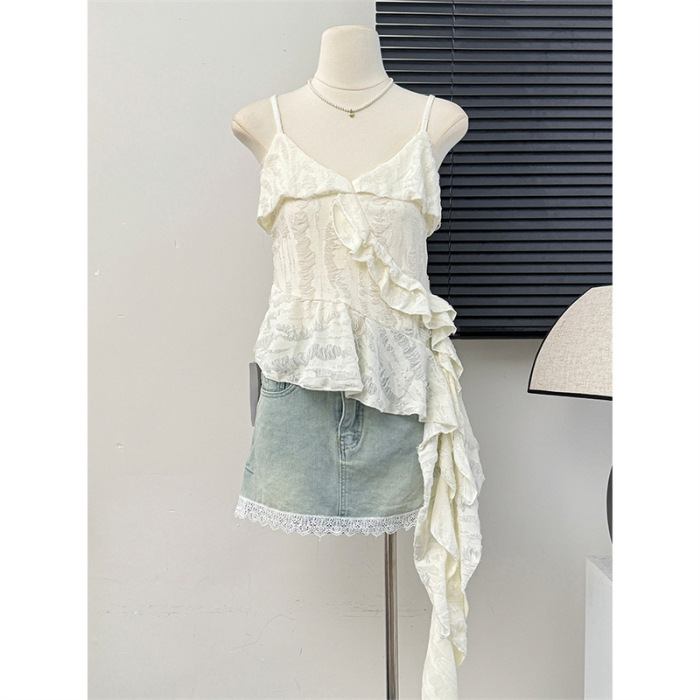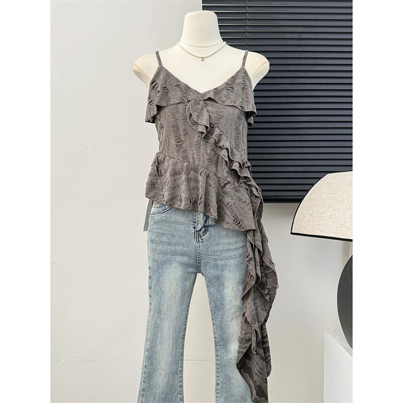 MR 原版破洞布 复古不规则荷叶边拼接做旧磨破吊带背心女夏