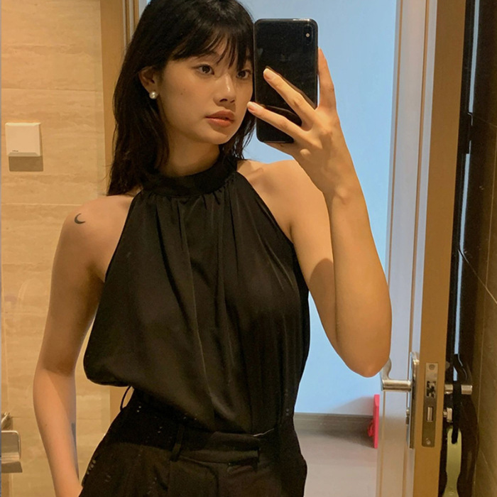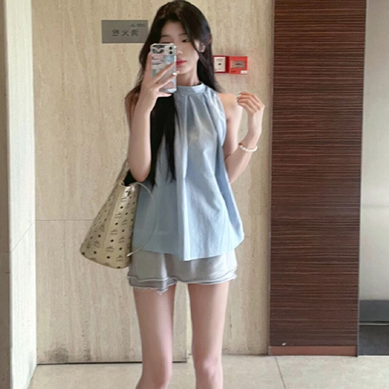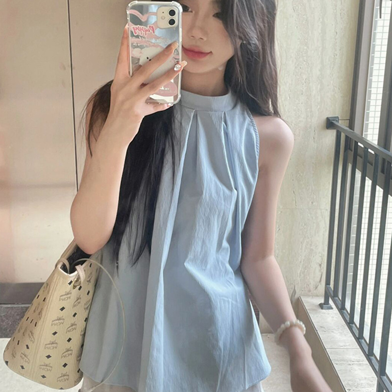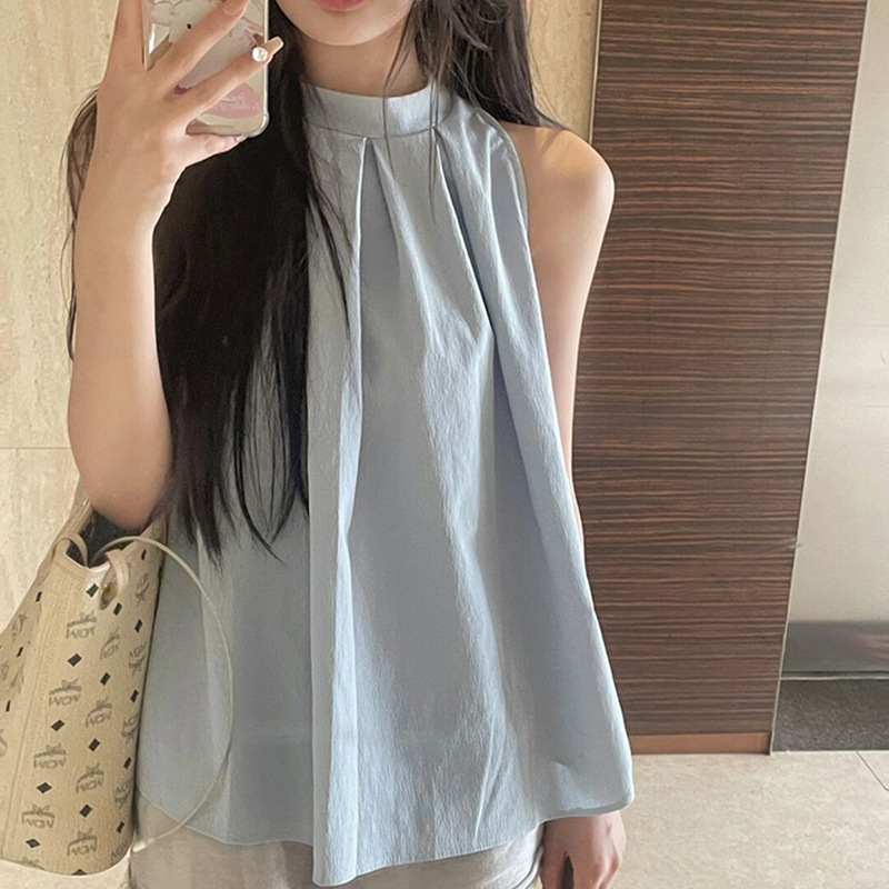 官图实价 韩系无袖挂脖衬衫女装夏新款设计感别致褶皱蓝色上衣潮