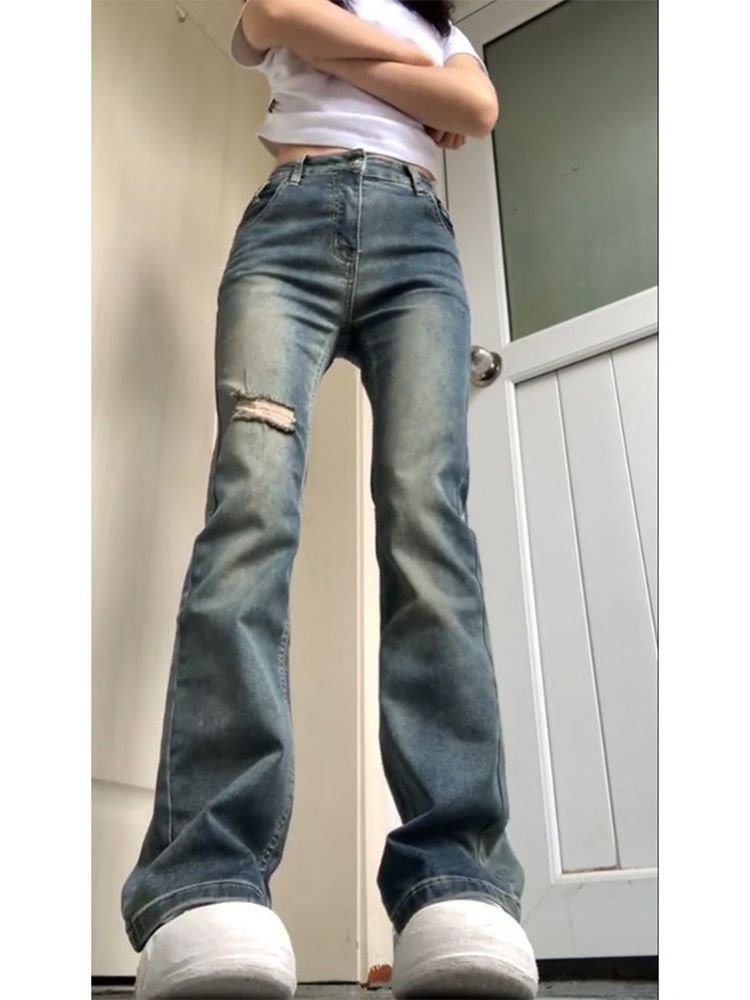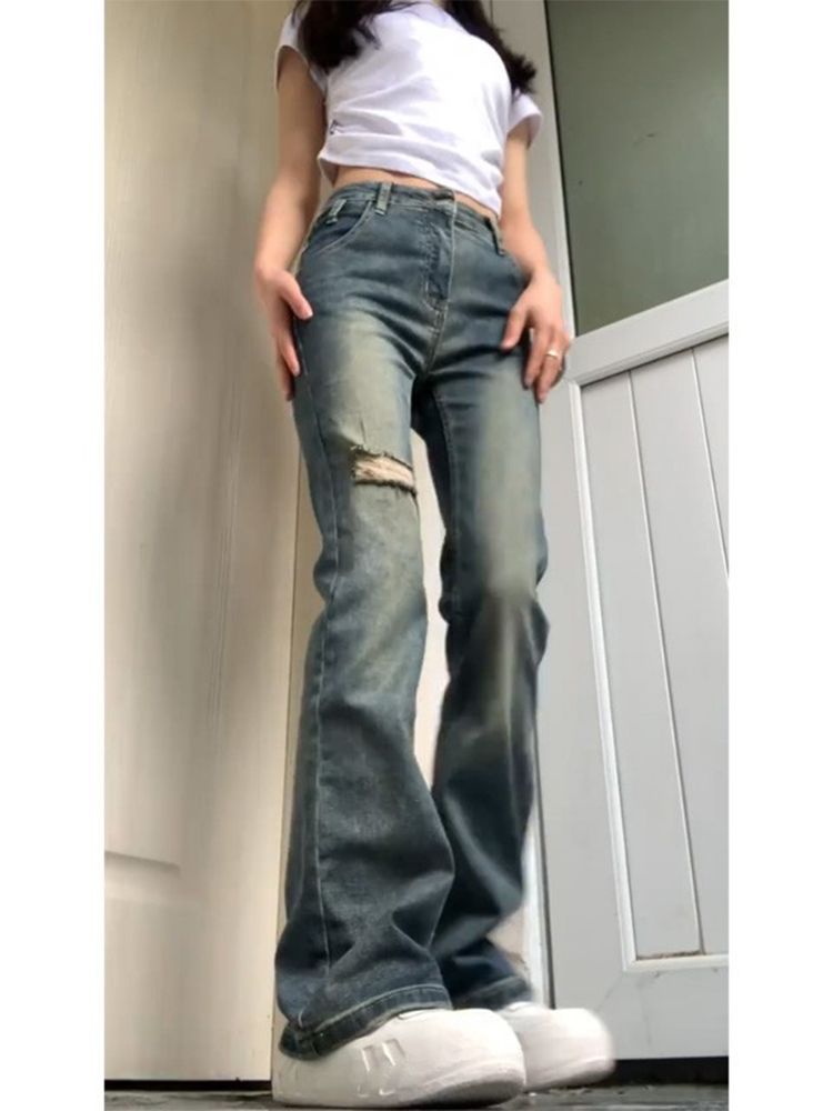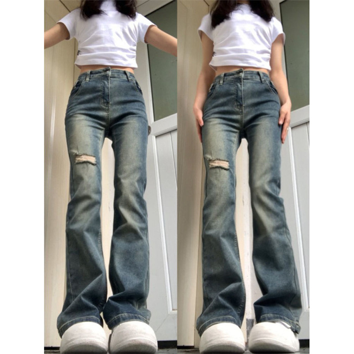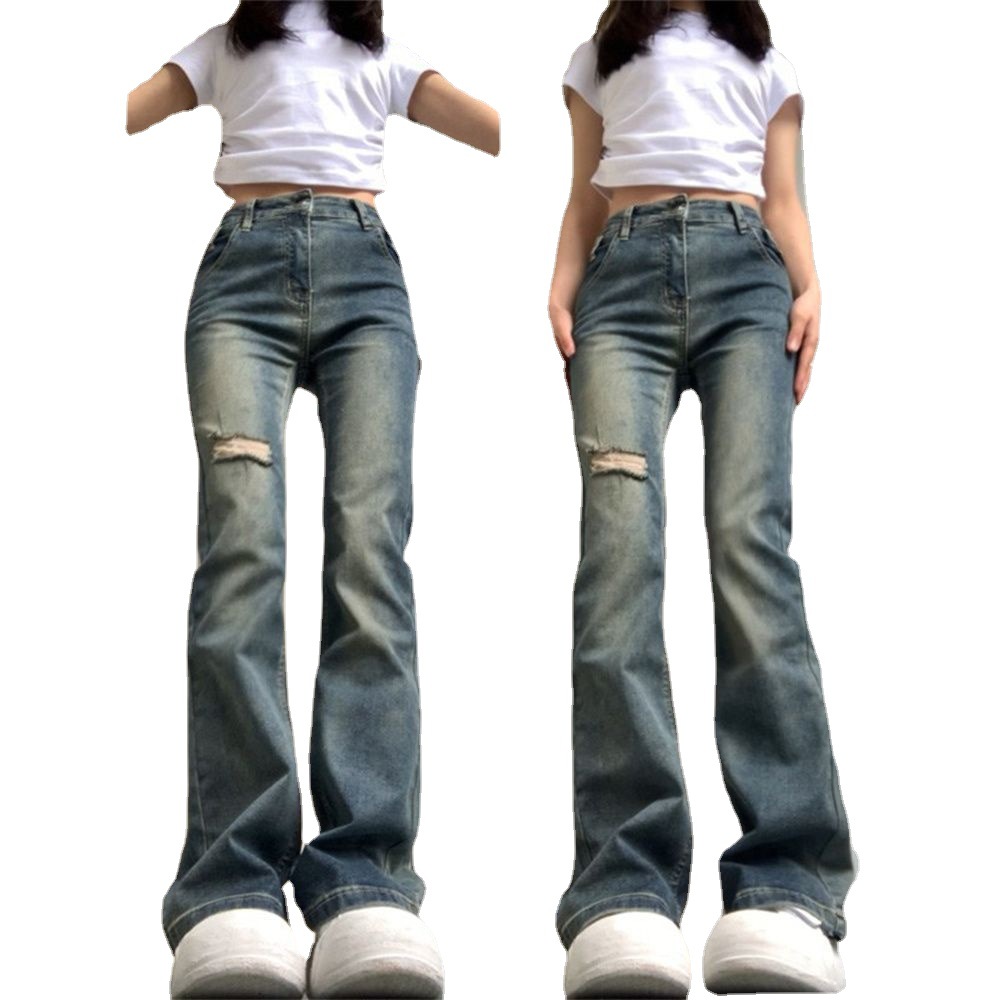 破洞复古水洗微喇叭牛仔裤女大码高腰弹力显瘦坠感长裤子直筒潮