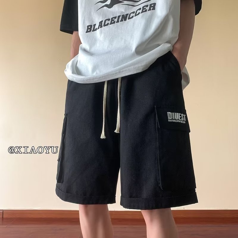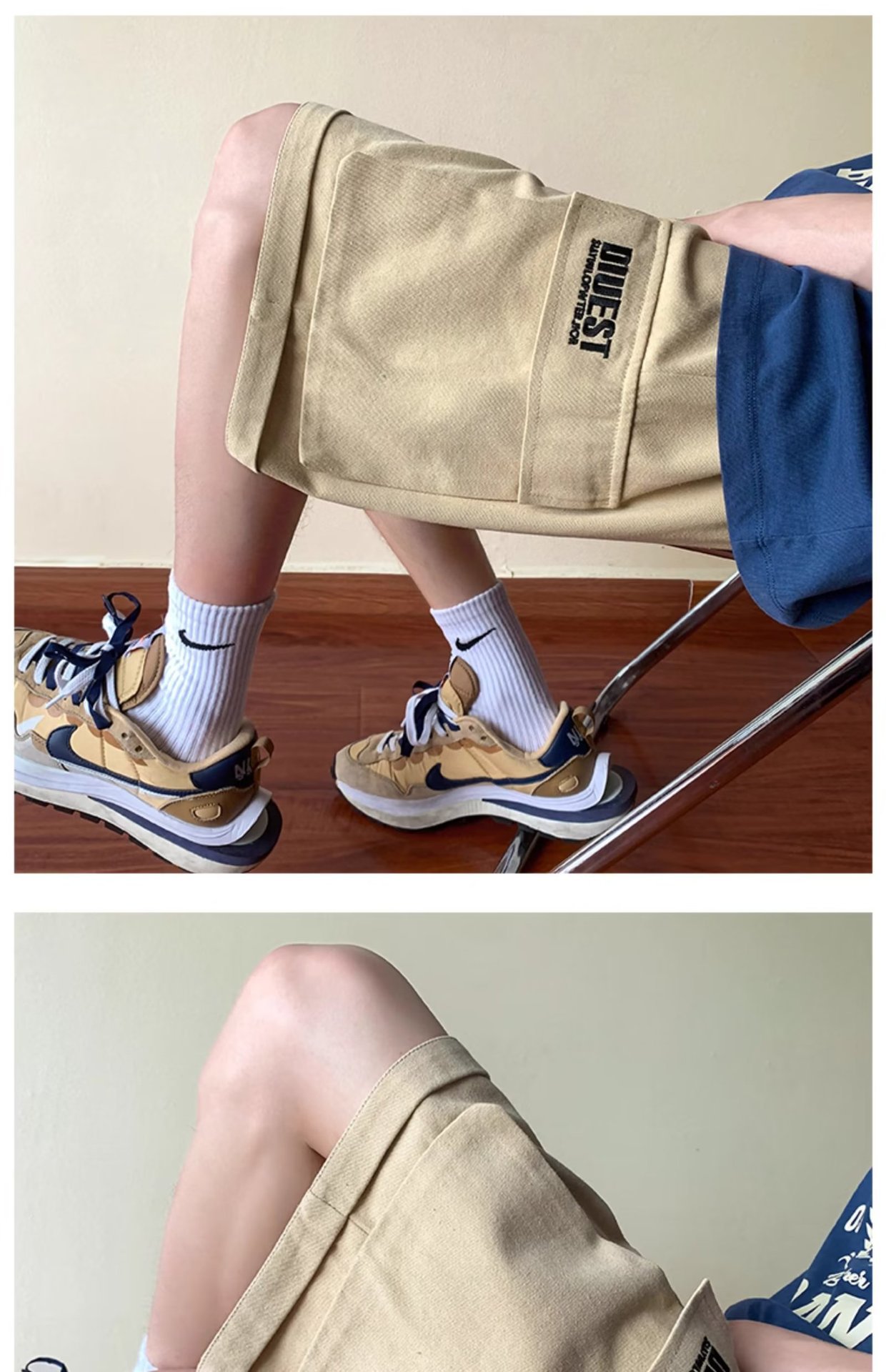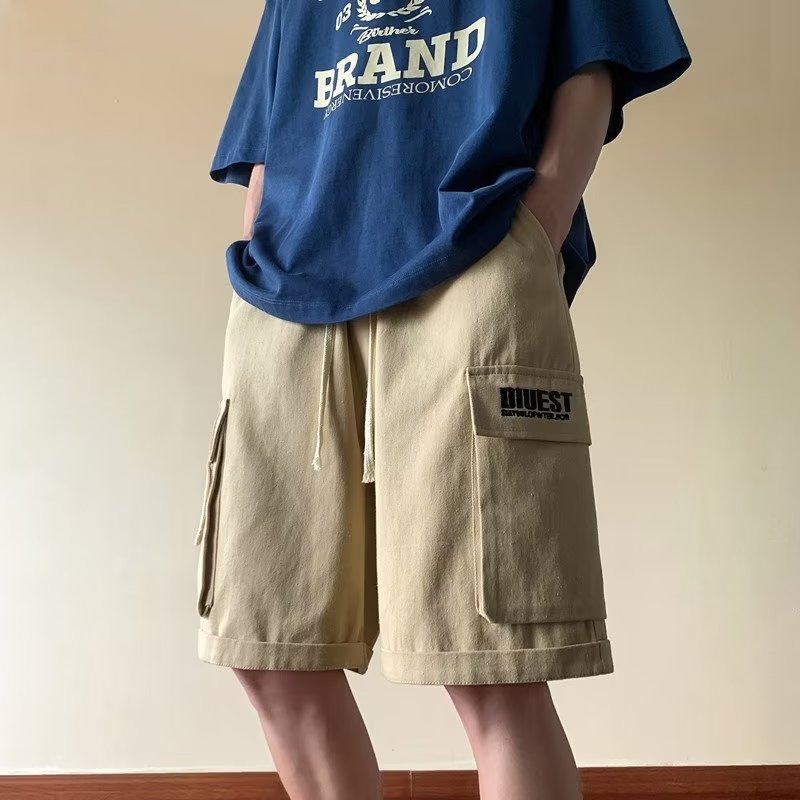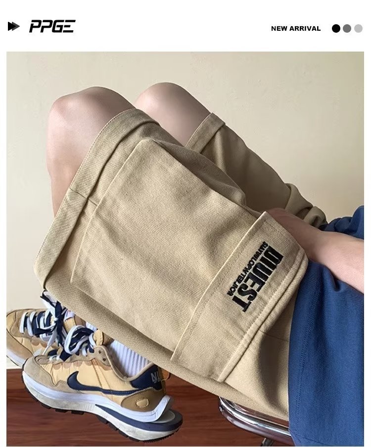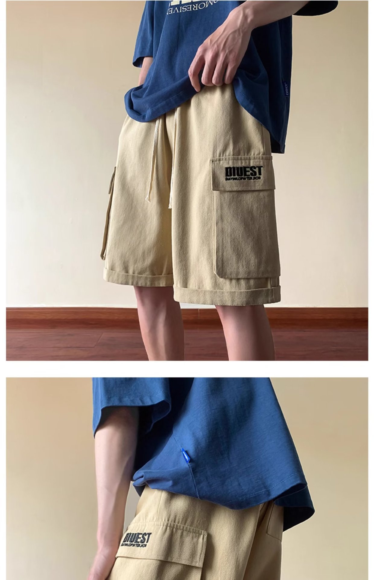 卡其色工装短裤男士夏季日系宽松休闲中裤潮牌刺绣多口袋五分裤子