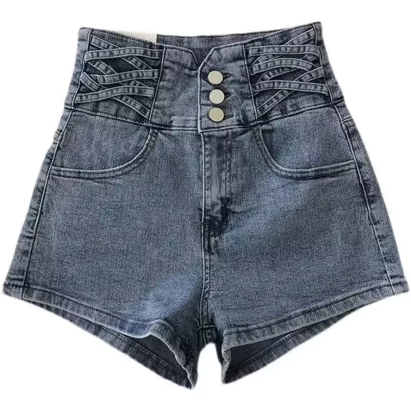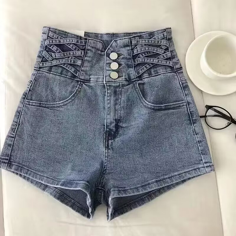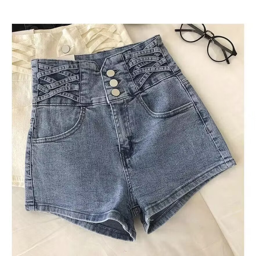 辣妹小蛮腰交叉编织高腰收腹牛仔短裤女韩版提臀宽松阔腿热裤潮