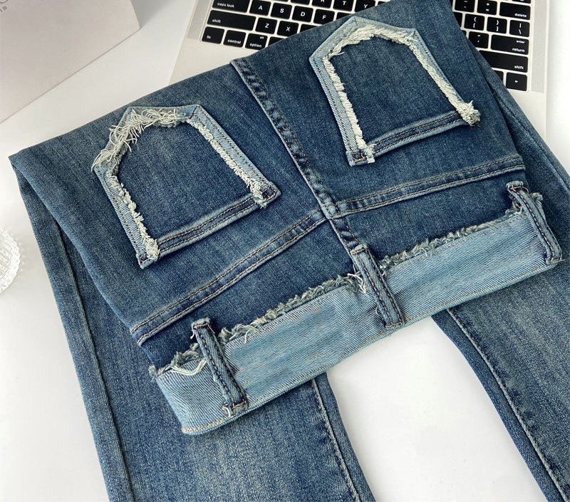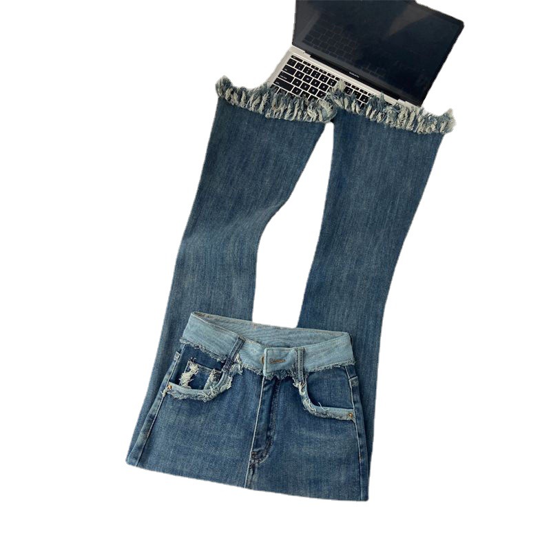 夏季新款高腰流苏微喇叭牛子裤女弹力修身复古毛边显瘦马蹄裤