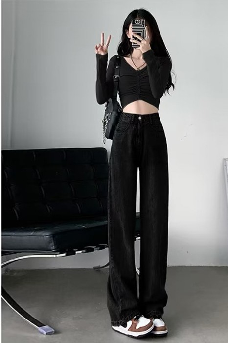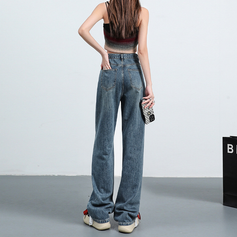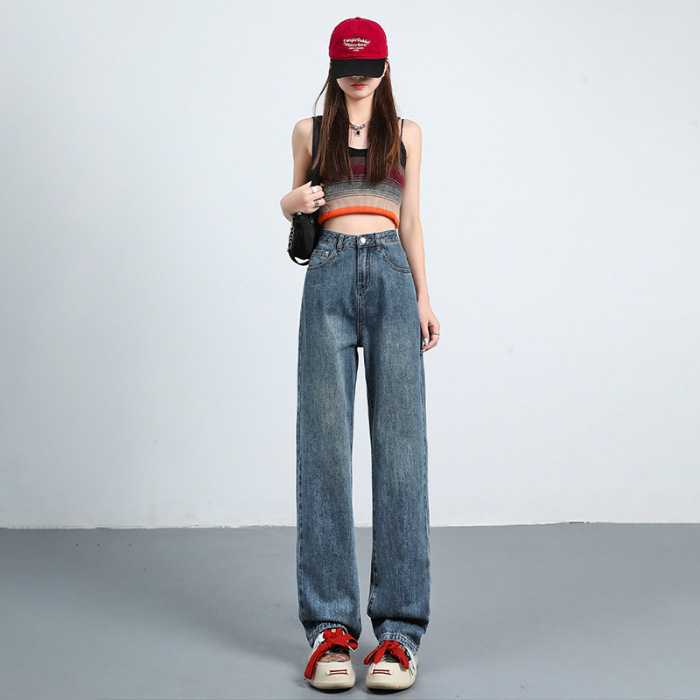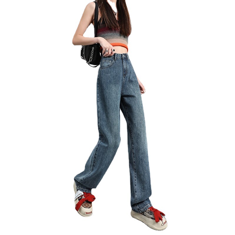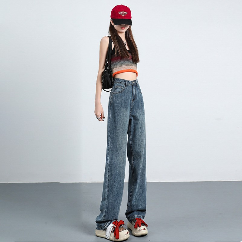 口袋设计感高腰复古蓝直筒牛仔裤女夏季宽松显瘦垂感拖地长裤子潮