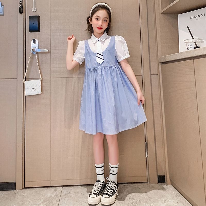 女童连衣裙夏装新款儿童网红公主裙洋气夏季大童假两件背带裙