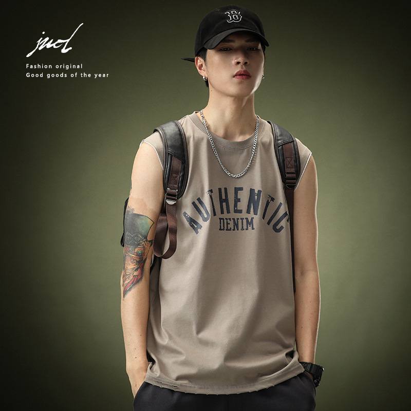 高街刮烂无袖t恤男士夏季ins健身运动训练坎肩假两件叠穿美式背心