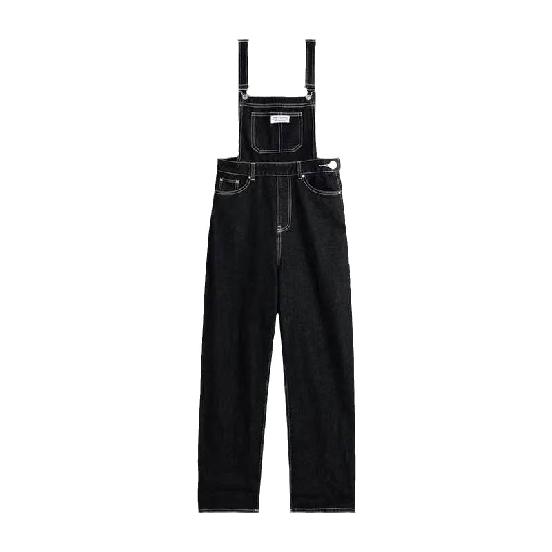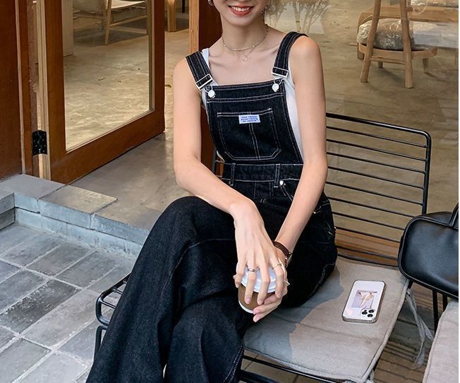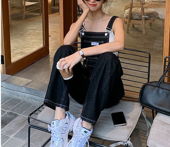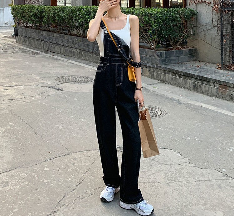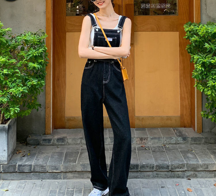 夏季新款牛仔背带裤洋气高腰减龄显瘦宽松连体排扣裤黑色牛仔裤潮