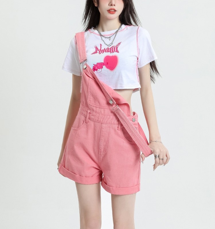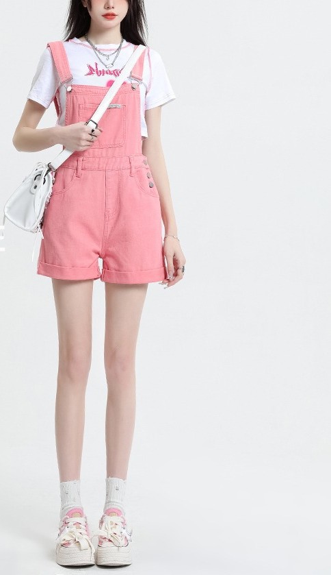 粉红色阔腿背带牛仔短裤女高腰宽松显瘦减龄设计感时尚可爱背带裤