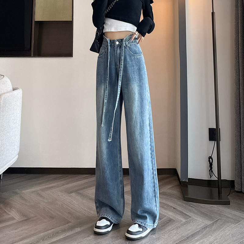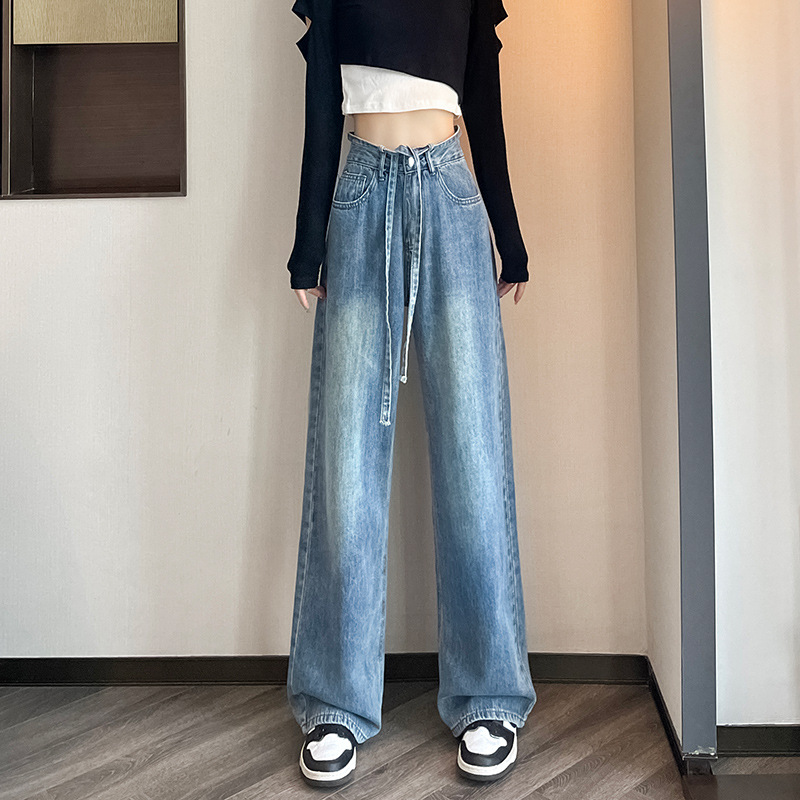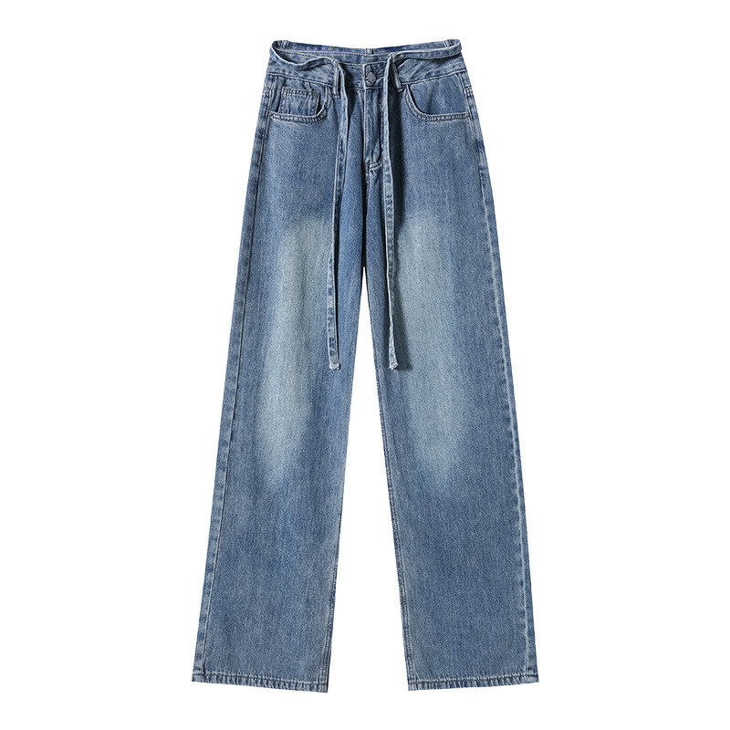 抽绳复古牛仔裤女夏季高腰宽松显瘦老爹裤直筒长裤拖地裤阔腿裤子