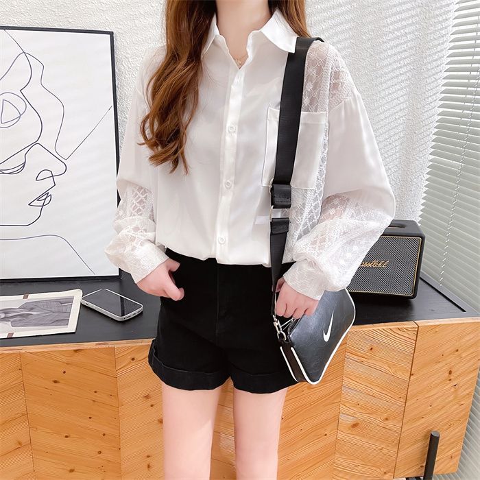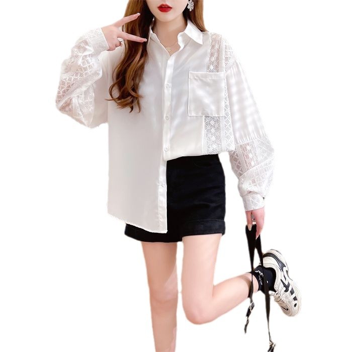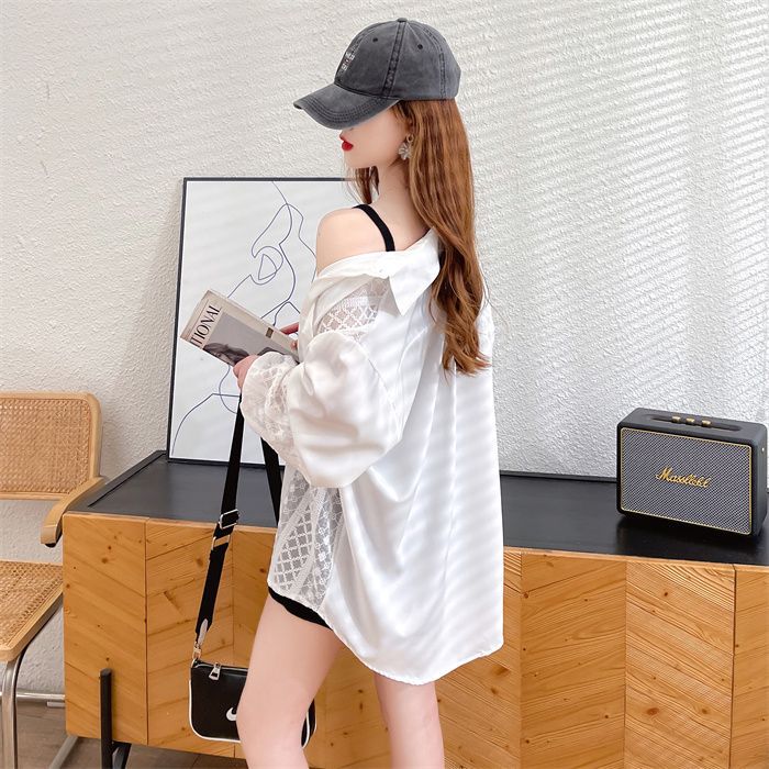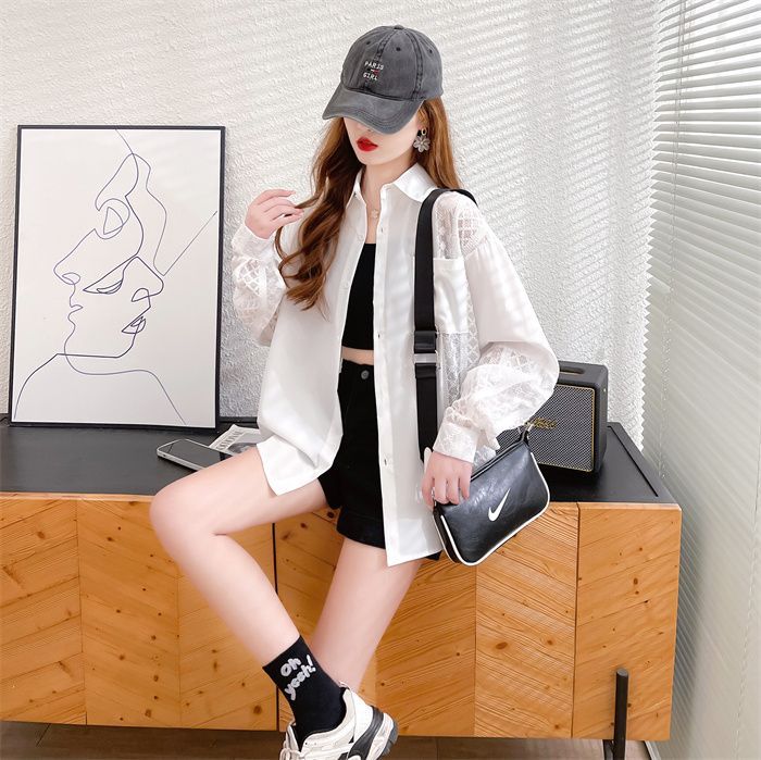 外贸大码女装韩版重工质量中长款开衫蕾丝拼接薄款外套衬衫雪纺衫