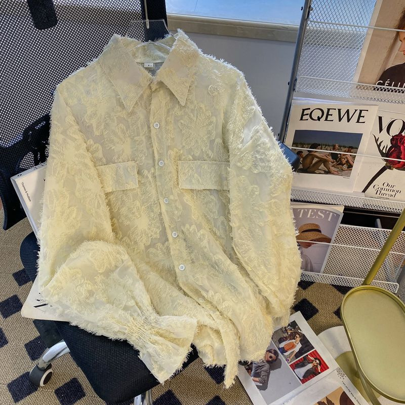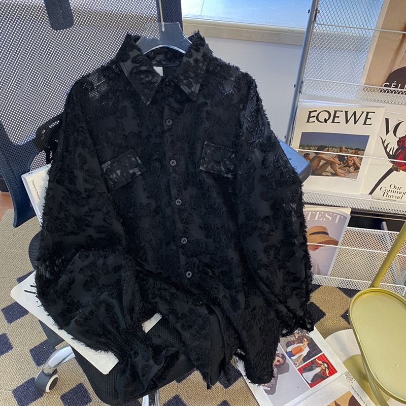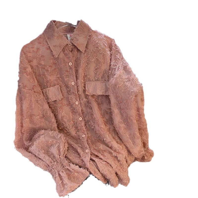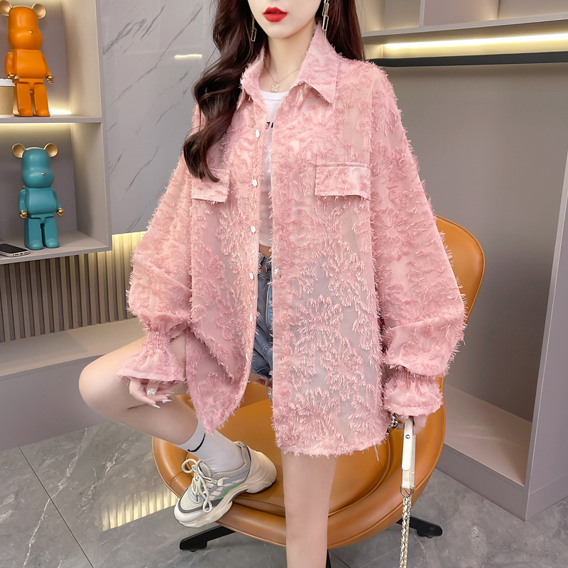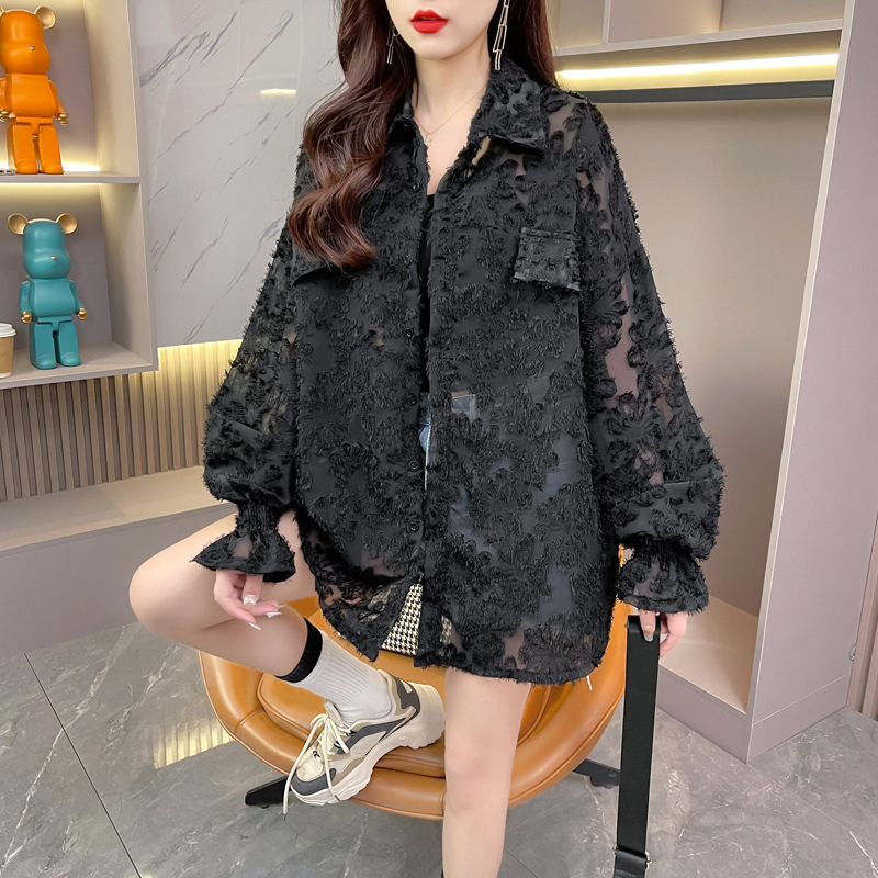 亚马逊外贸韩系薄款开衫大码女装新款中长款宽松polo领提花雪纺衫
