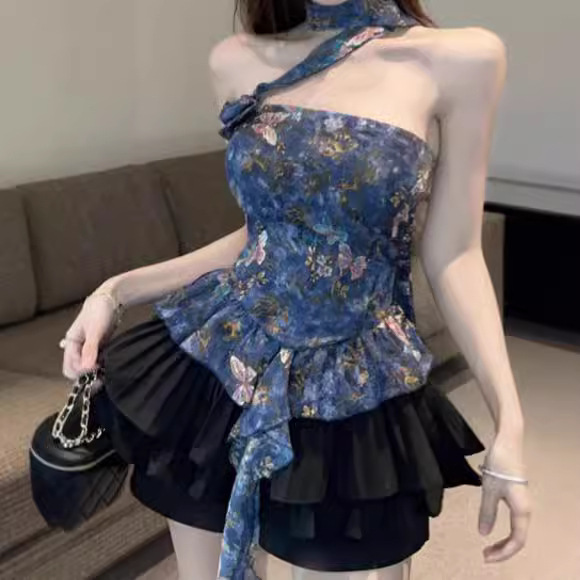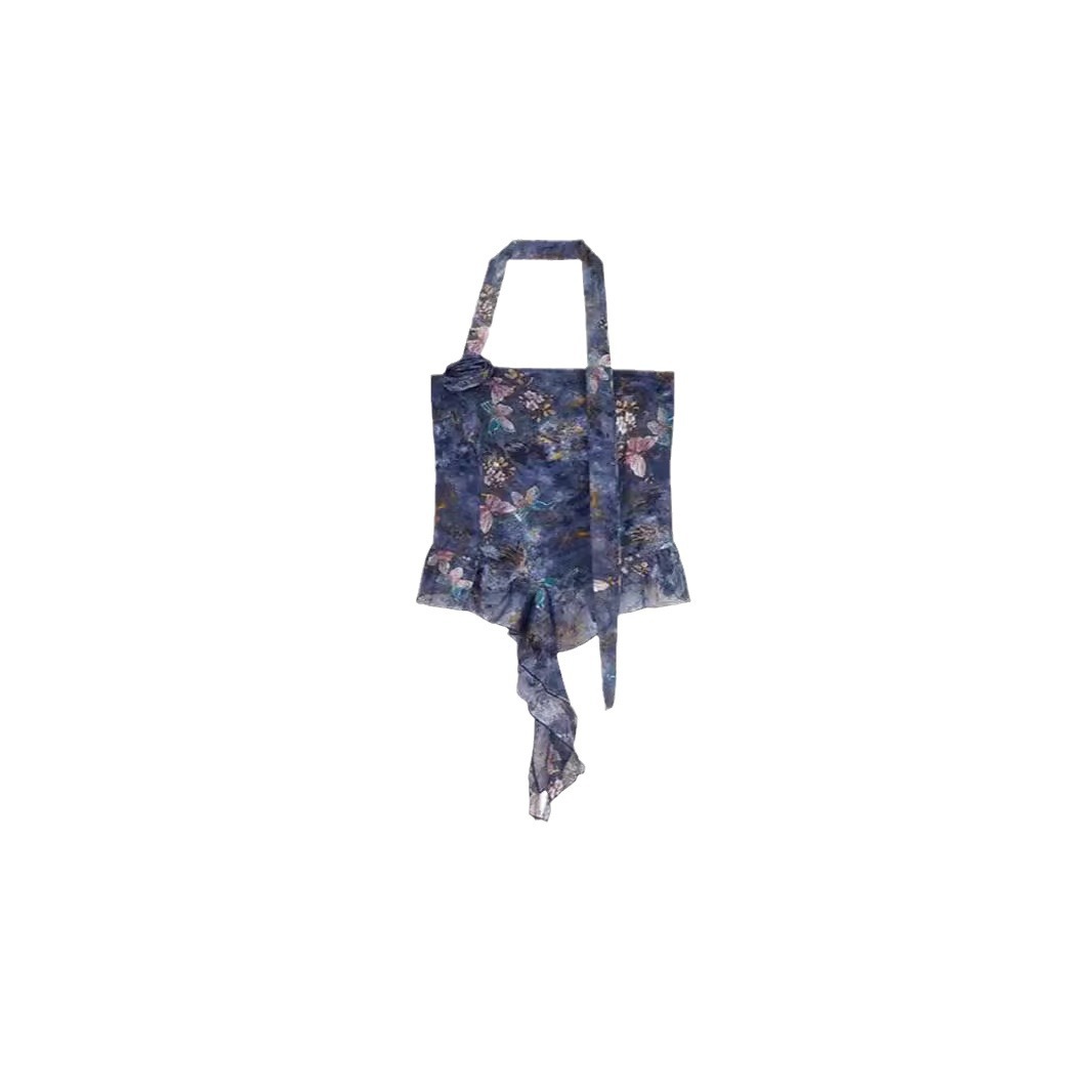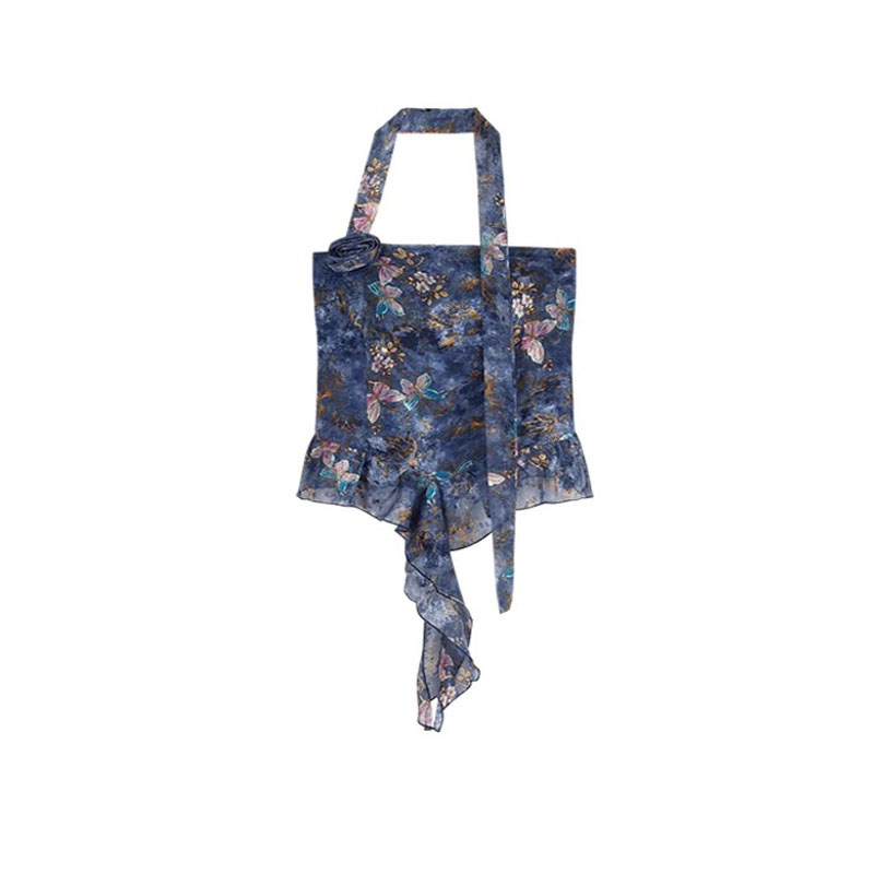 初秋法式上衣复古油画蝴蝶印花显瘦荷叶边不规则雪纺衫性感ins潮