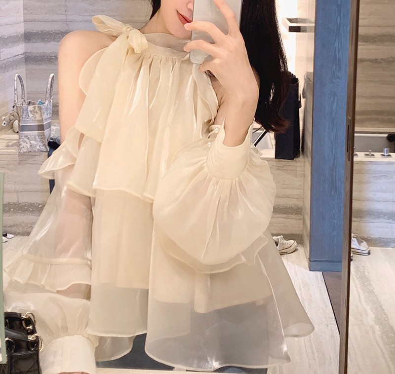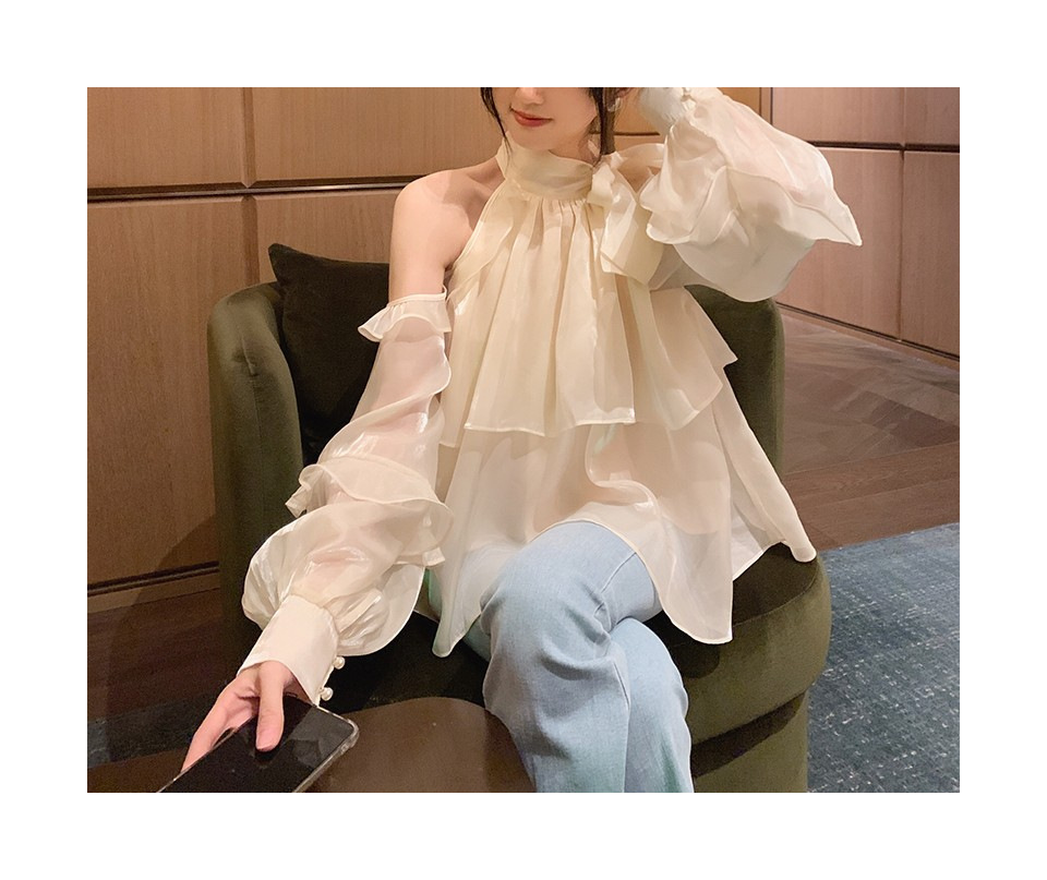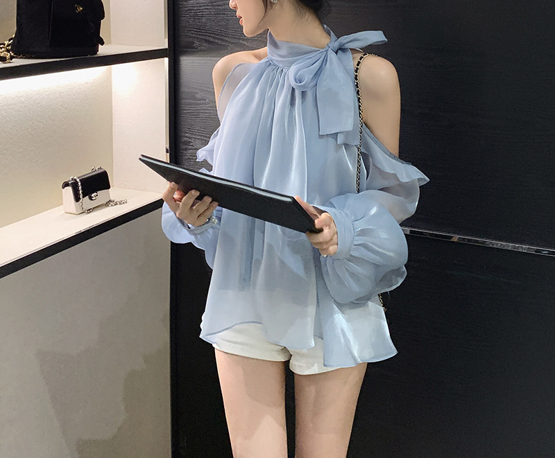 法式雪纺露肩无袖挂脖上衣设计感小众女夏季新款仙气气质衬衫衬衣