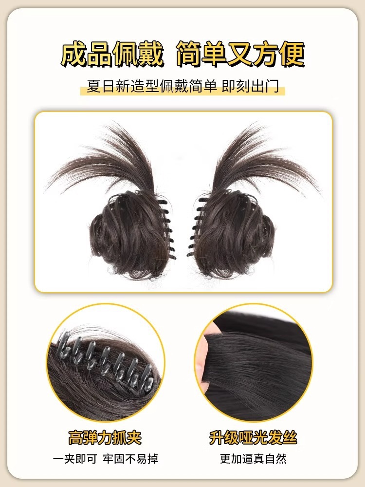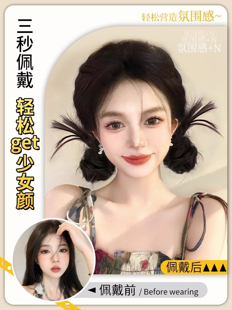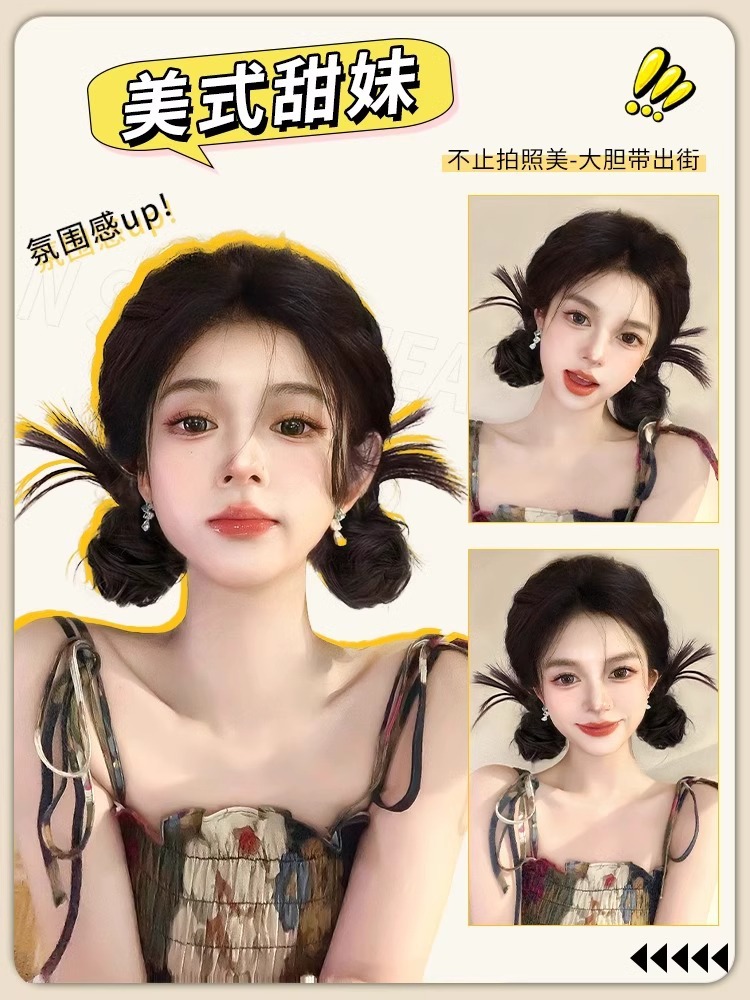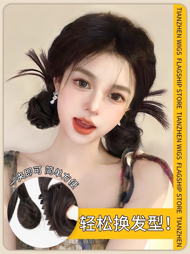 假发女辣妹鸡毛抓夹双丸子一体式发包鸡毛毽子仿真发假发发包头饰