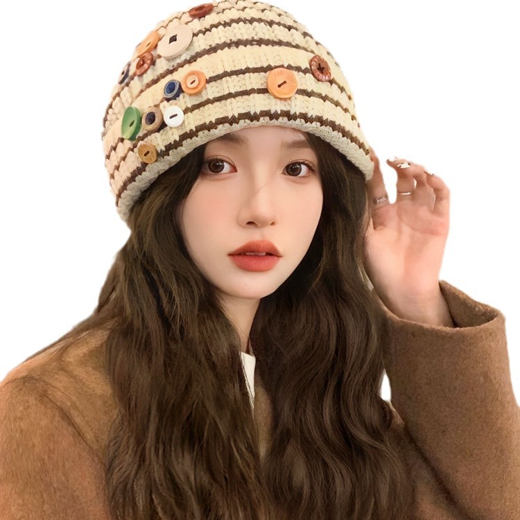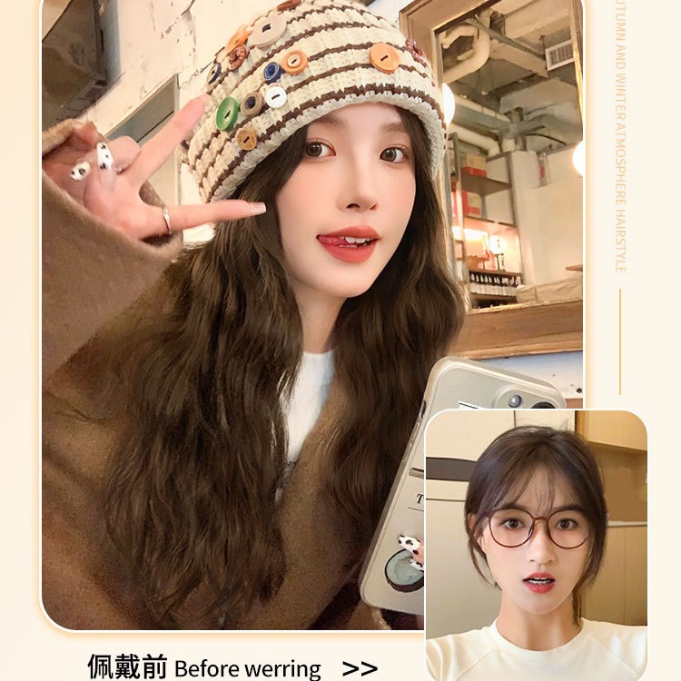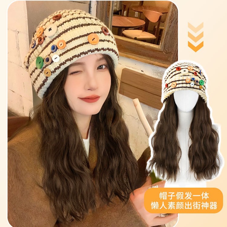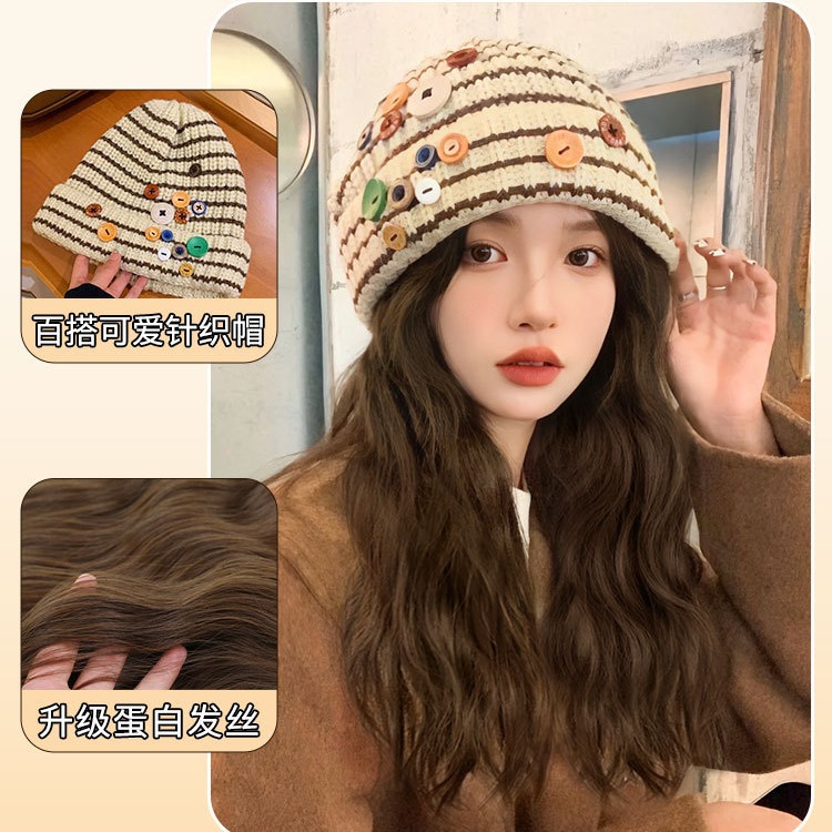 戴帽子的假发女一体秋冬新款时尚水波纹可拆卸纽扣针织帽全头套