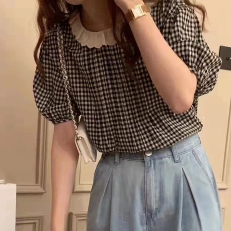 韩国东大门甜美蕾丝花边领减龄泡泡袖前后两穿格子衬衫女
