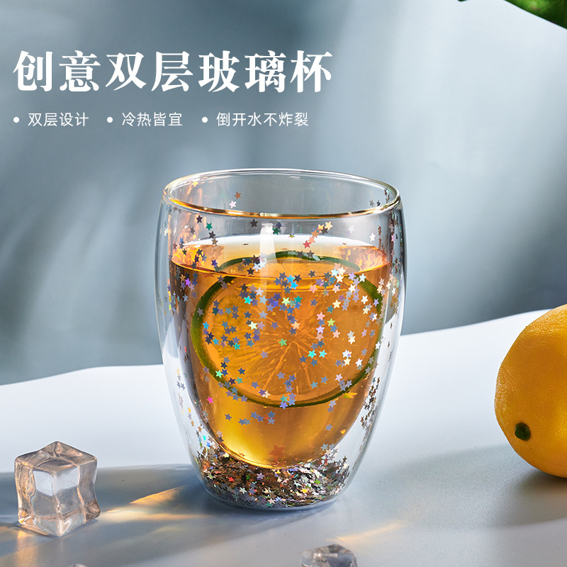 网红星空杯家用夏季水杯女 彩色星星光杯可爱创意ins风双层玻璃杯