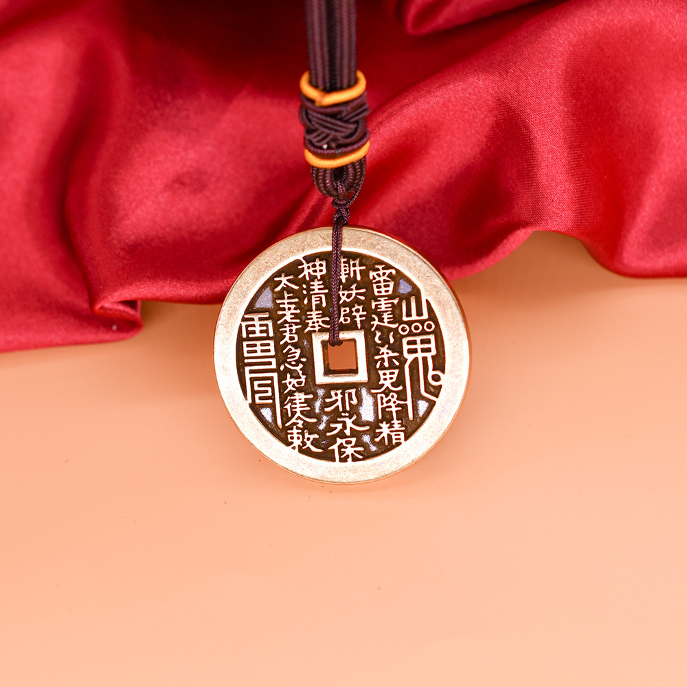 古风纯黄铜朱砂山鬼花钱吊坠乾坤八卦铜钱挂件道家铜钱饰品挂饰