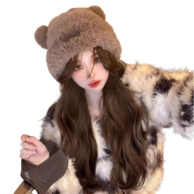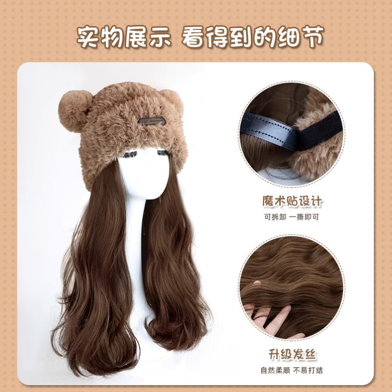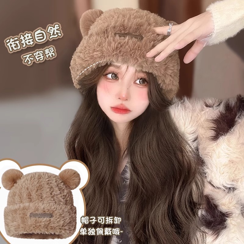 假发帽子一体女秋冬季新款网红款小熊帽带假发全头套长发仿真自然