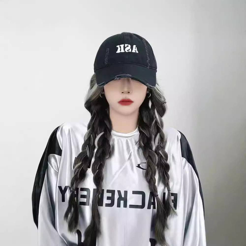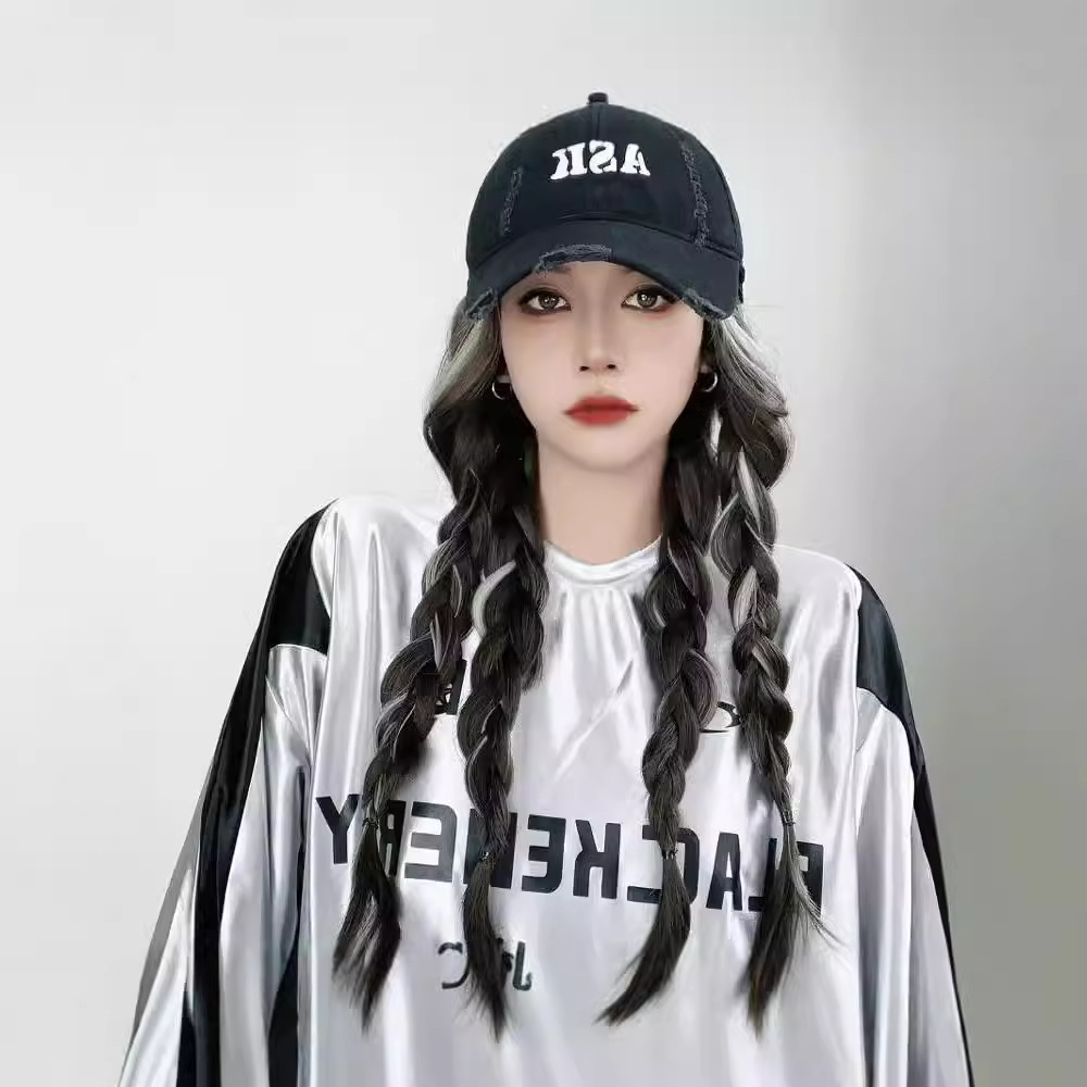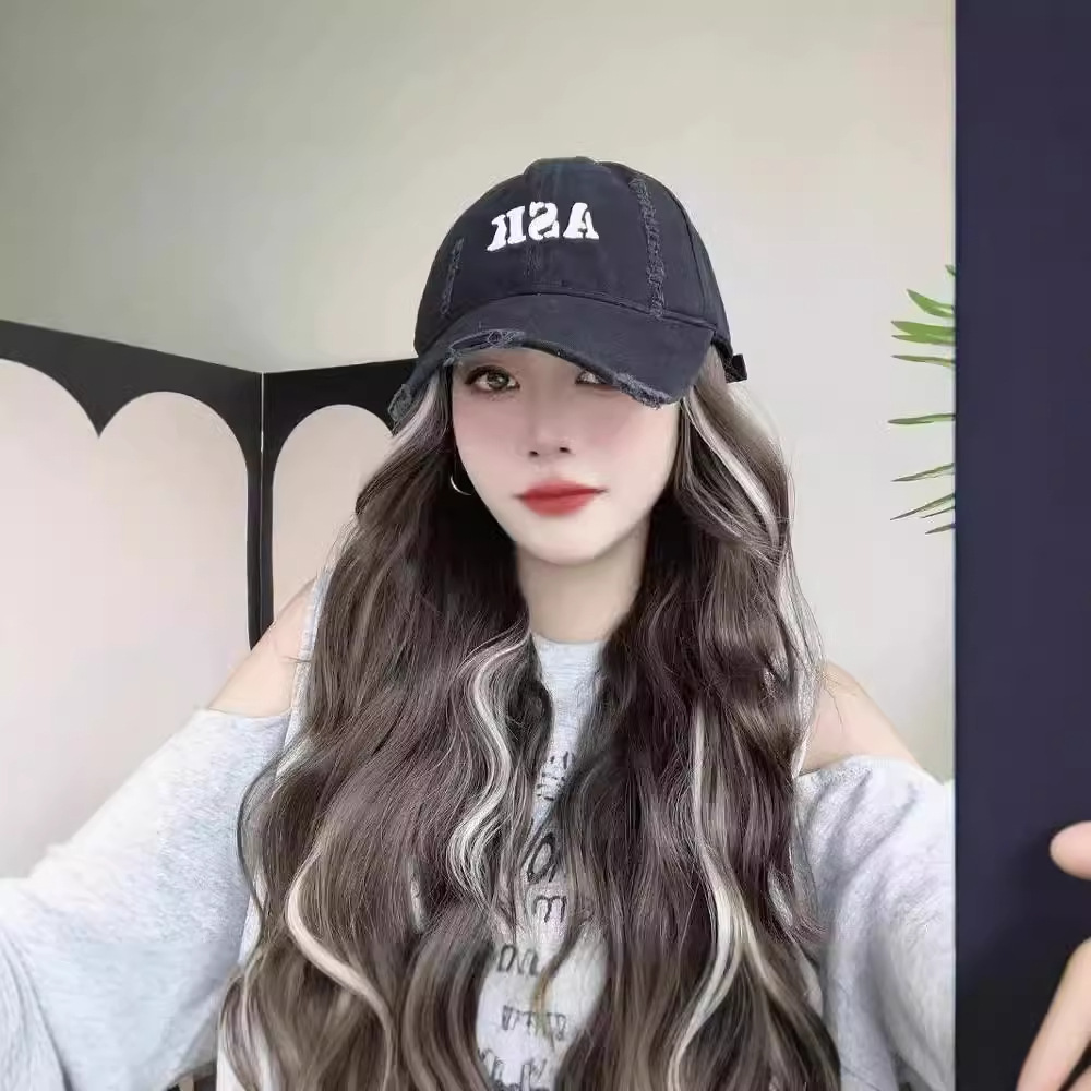 挑染亚裔色棒球帽假发鸭舌帽网红时尚潮流仿真发一体式假发长卷发