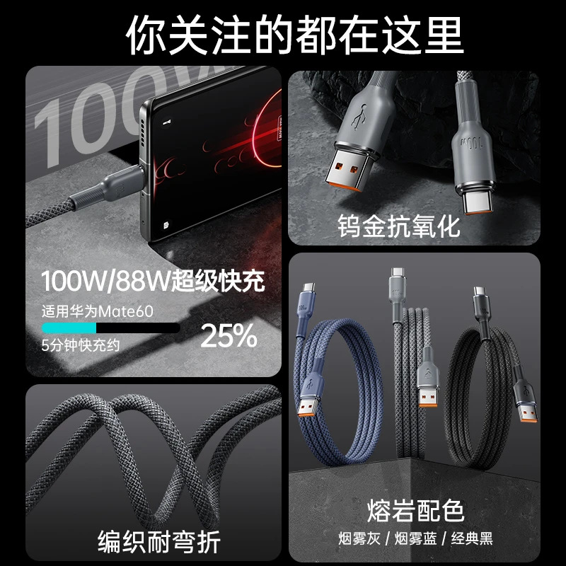 100W超级快充Type-C数据线双typec适用华为荣耀小米车载充电器线