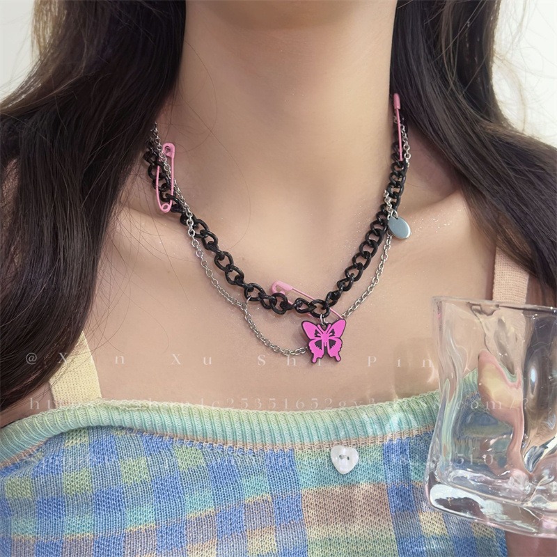 黑色别针蝴蝶吊坠项链女甜酷辣妹风y2k双层叠戴小众高级感锁骨链